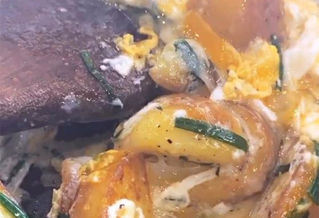 Bevor es komplett stockt, noch einen Löffel griechischen Joghurt in die Pfanne geben und anrichten.