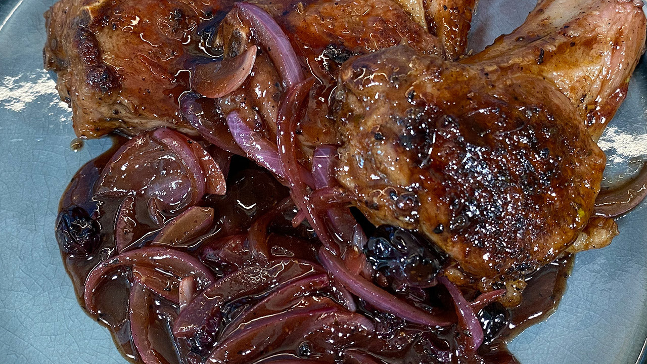 Zwiebeln in die Fleischpfanne geben, Blaubeeren dazugeben, mit Salz und Zucker würzen, mit Rotwein ablöschen und Rotwein verkochen lassen. Teriyaki-Sauce angießen.