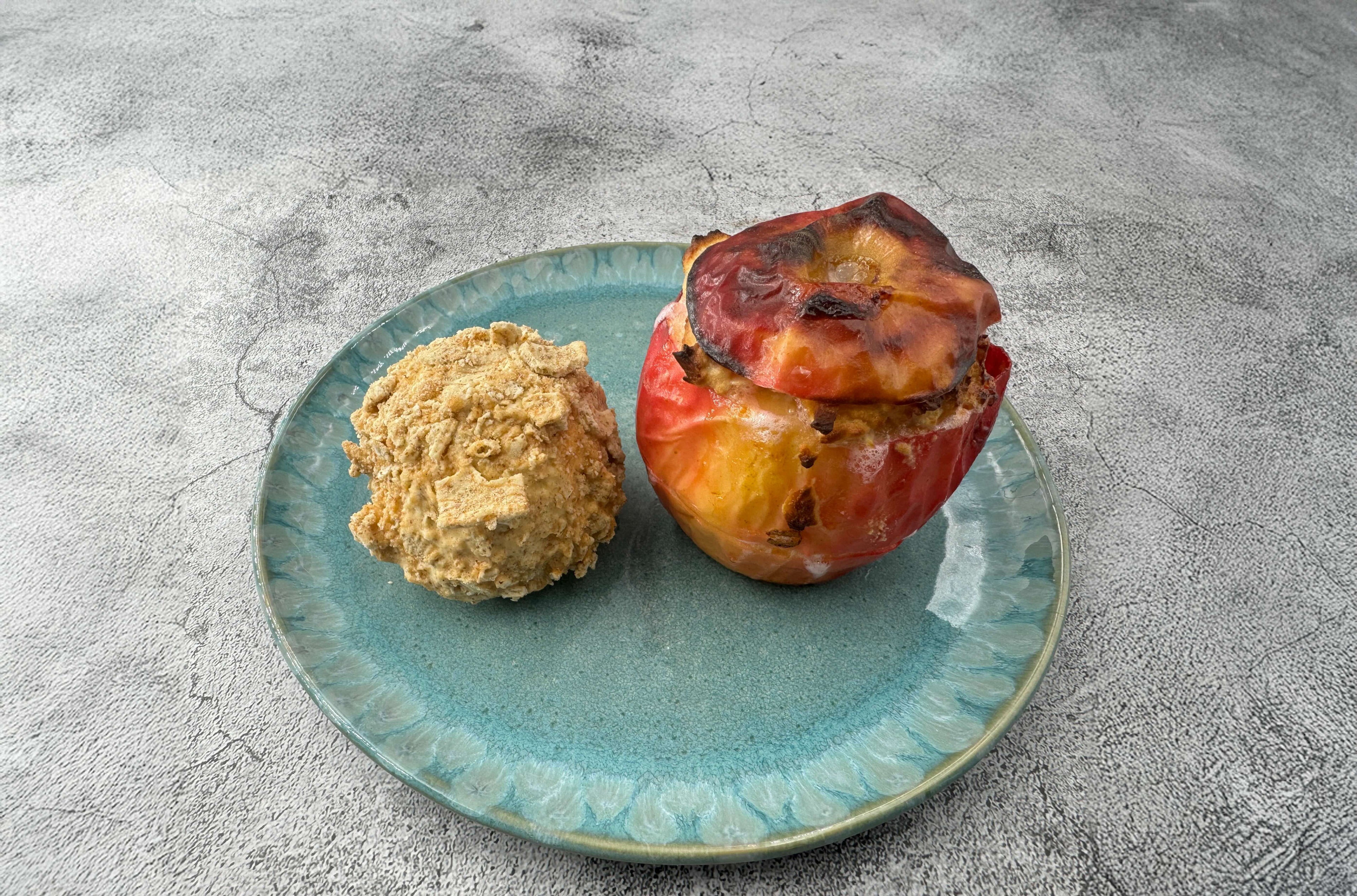 Sobald beide Garzeiten abgelaufen sind, jeweils einen Bratapfel zusammen mit einer Kugel Knusper-Vanilleeis auf zwei Tellern anrichten.