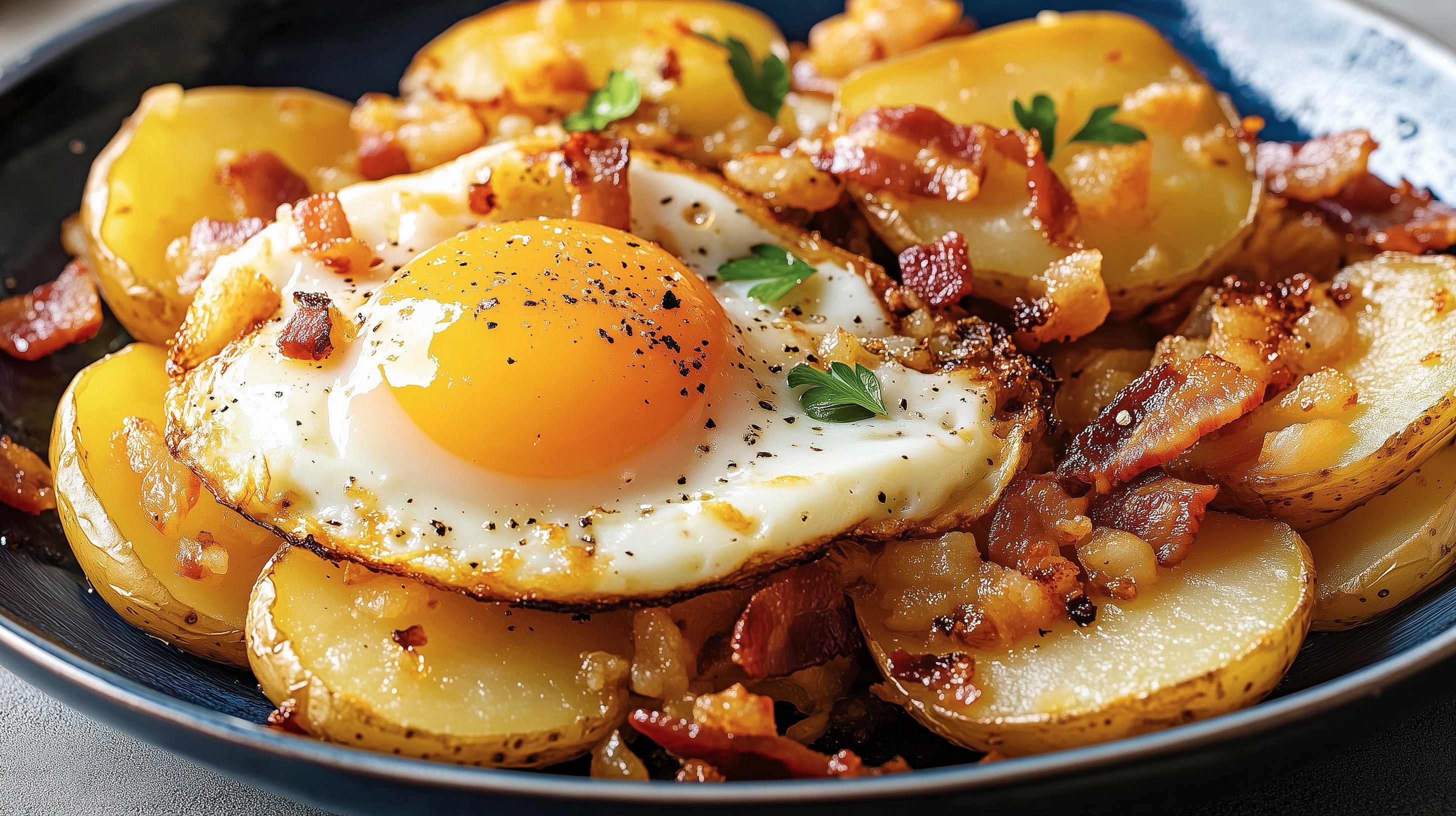 aus der Pfanne nehmen und mit Gewürzsalz und Pfeffermix würzen. Bratkartoffeln mit Spiegeleiern auf