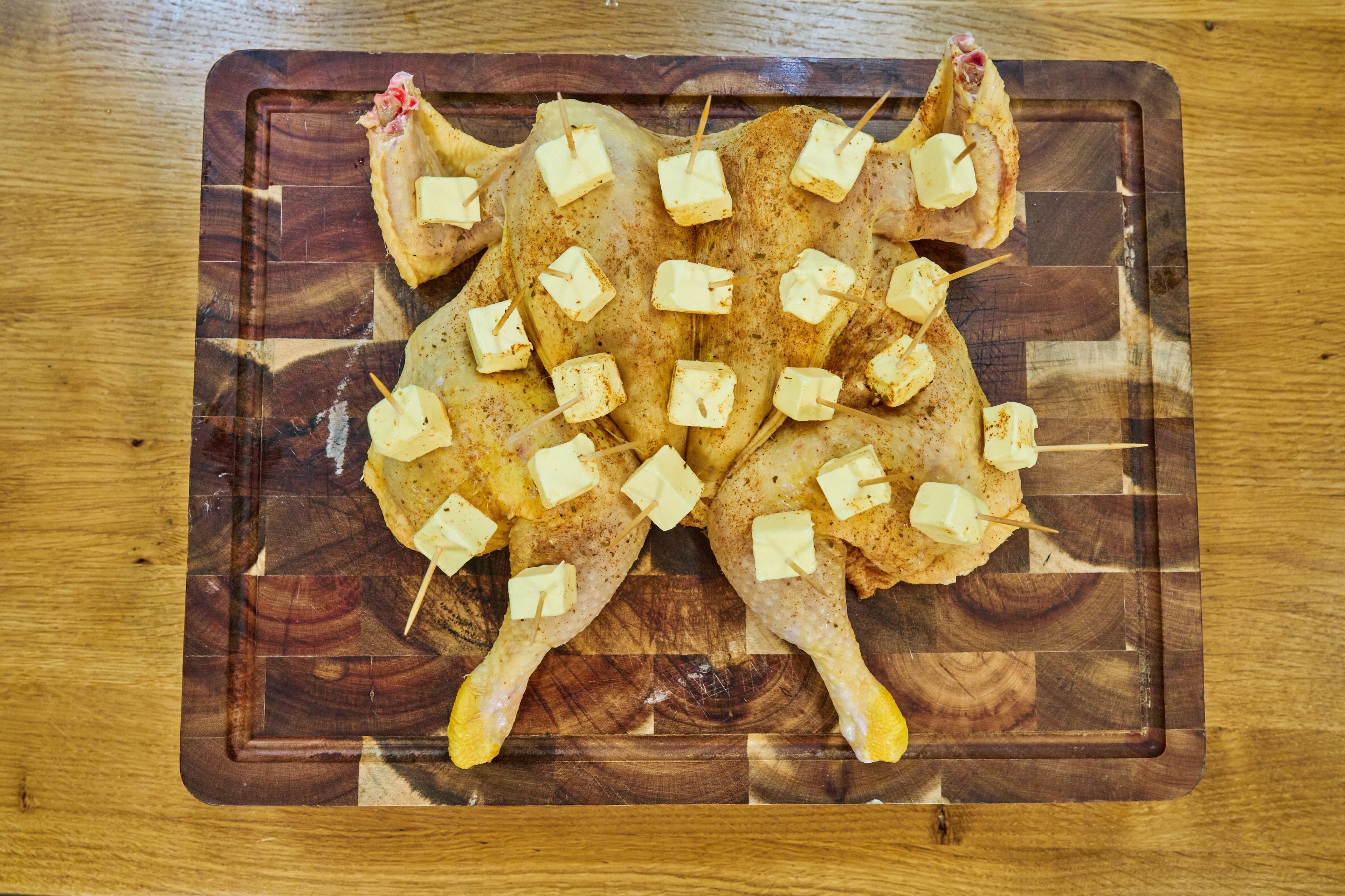 Vom Hähnchen den Bürzel und die Flügelspitzen entfernen. Das Hähnchen am Rückgrat entlang einschneiden, aufklappen, mit der Brustseite nach oben flach drücken und großzügig mit Hähnchen Gewürz und Gewürzsalz würzen. Die kalten Butterwürfel gleichmäßig auf dem Hähnchen verteilen und mit Zahnstochern fixieren. Das Hähnchen auf das Gemüse setzen. Die Flügelspitzen nach Wunsch mit in die Form legen. -