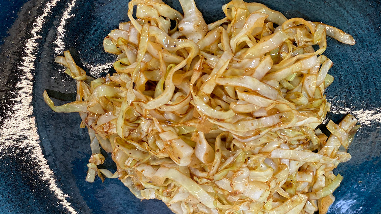 Sobald der Spitzkohl eine leicht braune Farbe hat, Pfanne vom Herd nehmen und Sojasauce darüberträufeln. Pfanne kurz wieder zurück auf die Hitze geben und Sojasauce kurz einkochen lassen. Alles gut verrühren und anrichten -