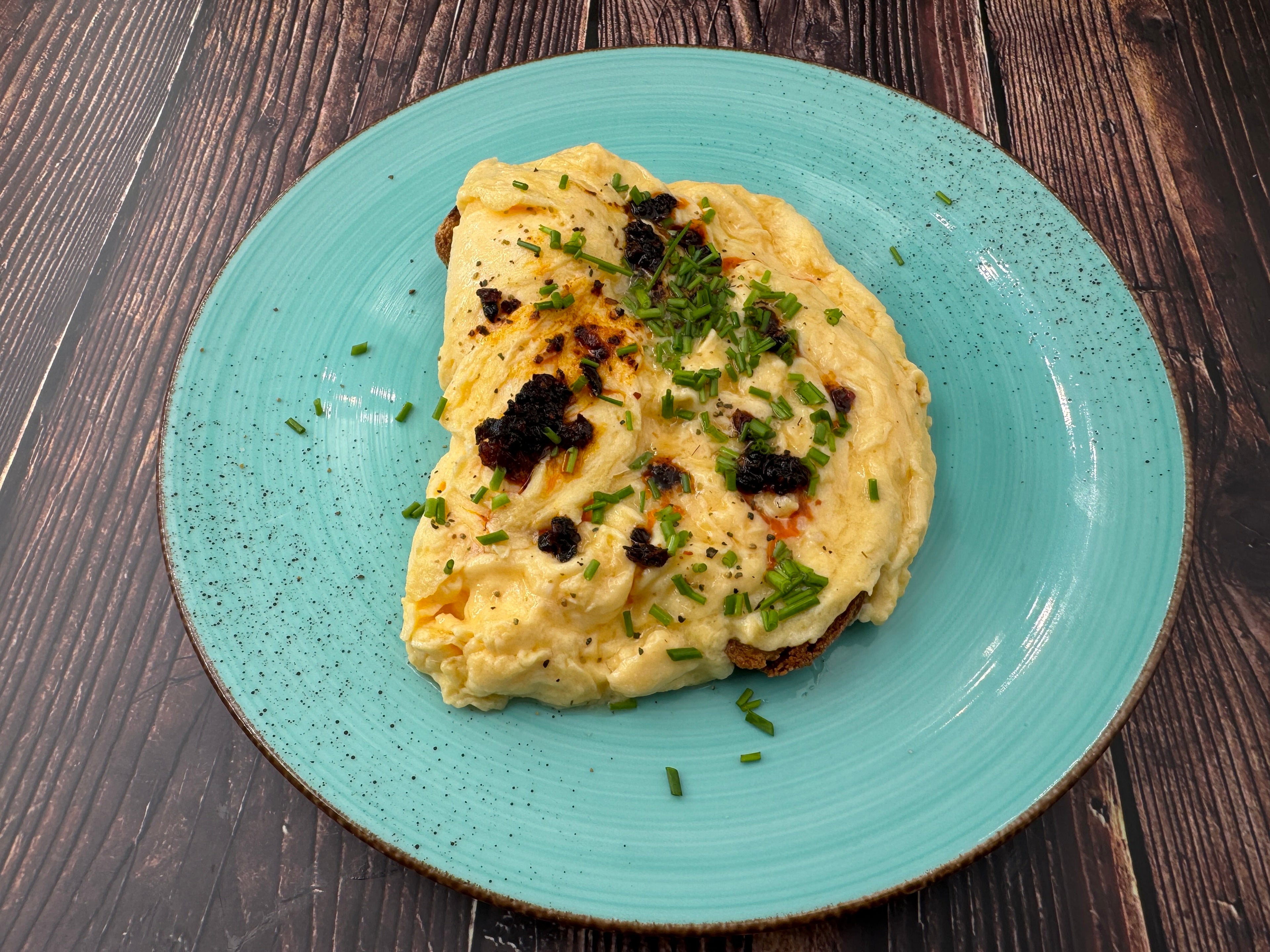 Rührei auf beide Brotscheiben verteilen und mit Gewürzsalz würzen. Nach Wunsch jeweils etwas Crispy Chili-Öl und Schnittlauchröllchen auf beiden Rühreiern verteilen.