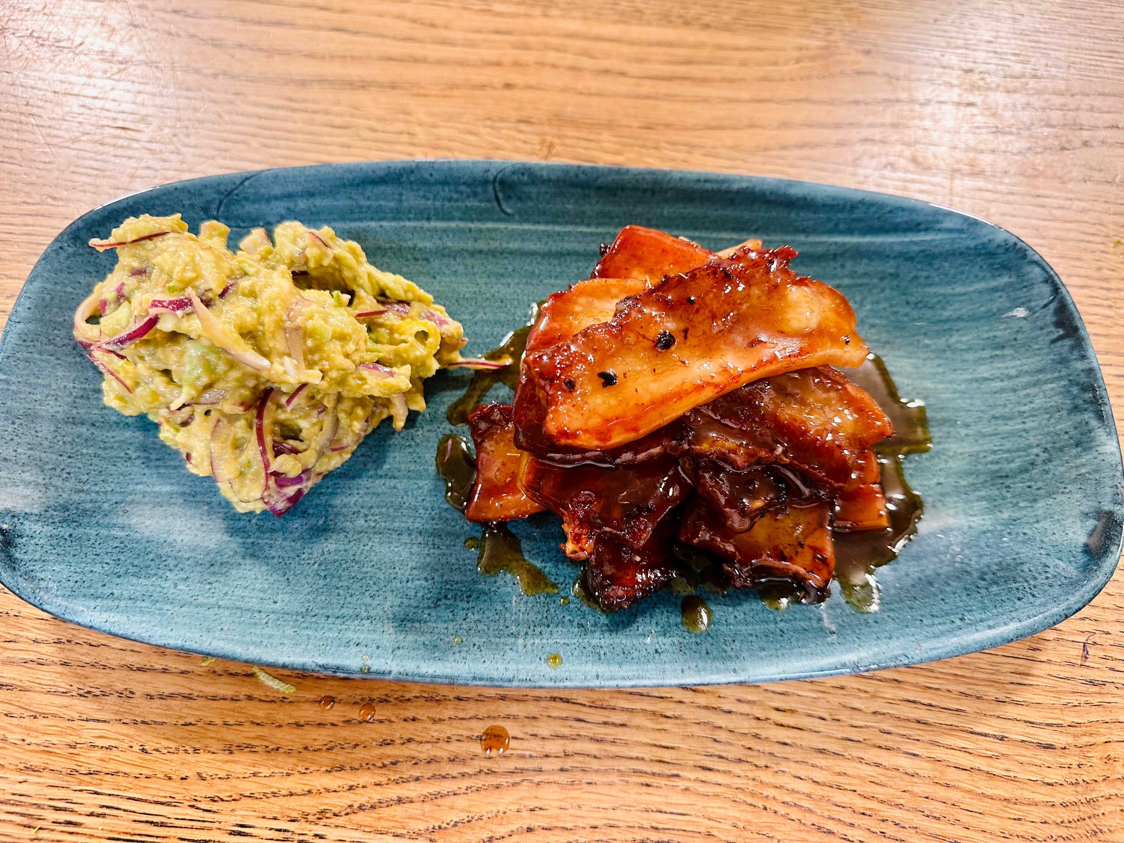 Schweinebauch und Avocado-Dip zusammen auf Tellern anrichten.