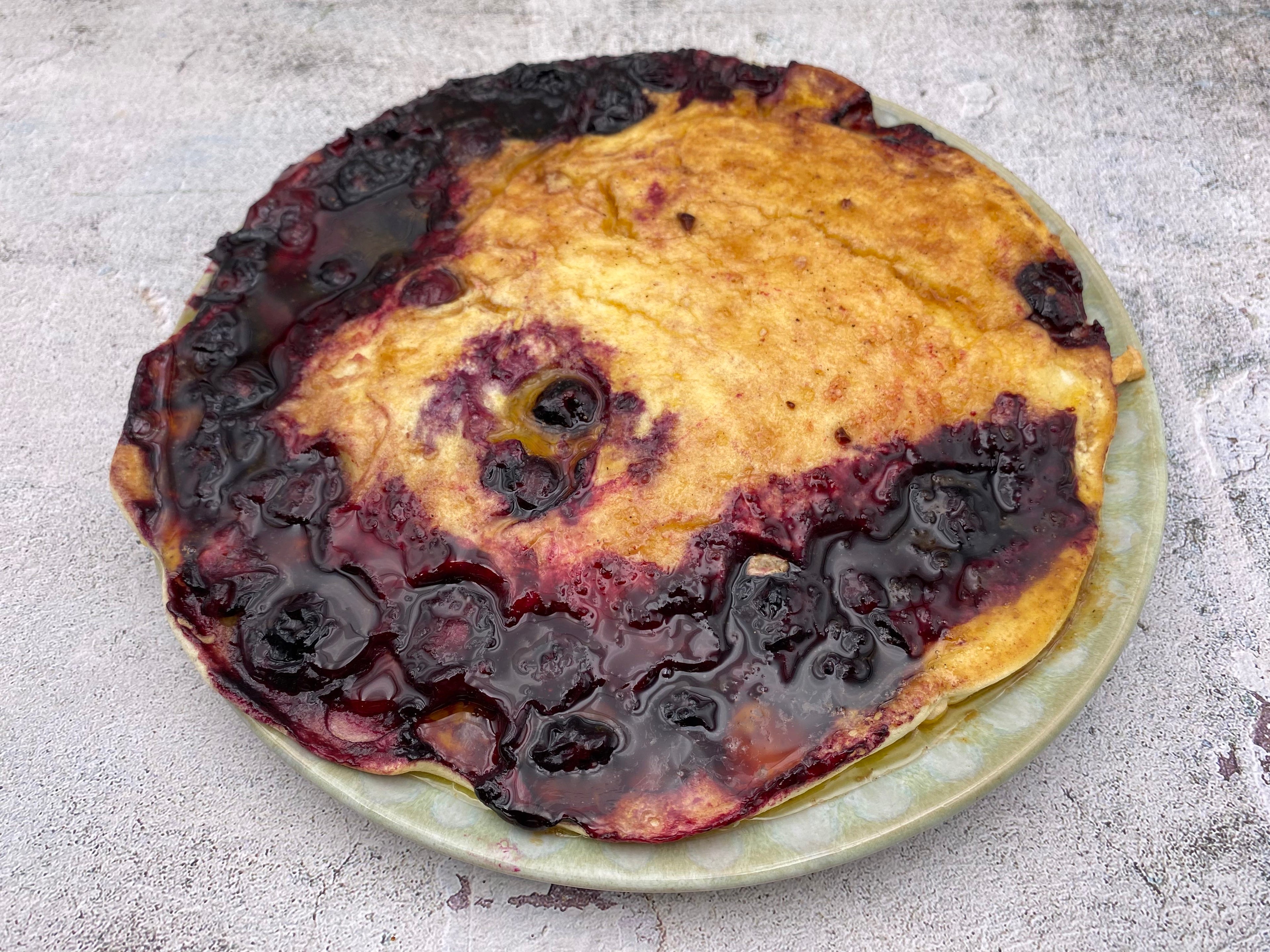 Währenddessen das geschlagene Eiweiß unter den Teig heben. Die Pfanne mit den Blaubeeren von der Hitze nehmen, die Blaubeeren gleichmäßig auf dem Pfannenboden verteilen und mit dem Pfannkuchenteig bedecken. Ein paar Blaubeeren auf dem Teig verteilen. Den Blaubeerpfannkuchen in der Pfanne ca. 10 Minuten in den heißen Ofen geben