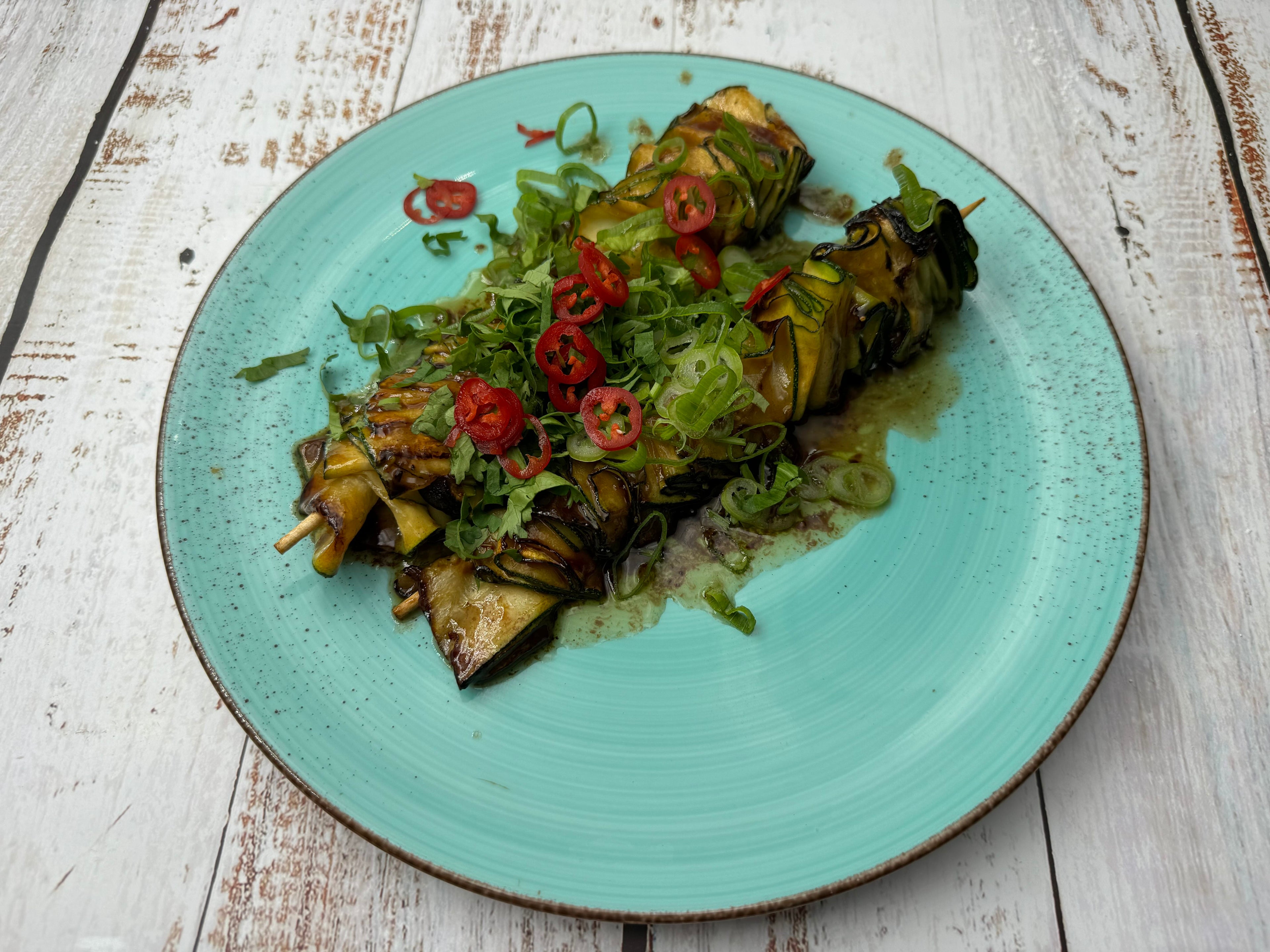 Die fertigen Zucchini-Spieße anrichten und jeweils etwas Sauce darübergießen. Koriander fein hacken und Frühlingszwiebel in Ringe schneiden. Beides über die Zucchini-Spieße streuen. Zum Schluss noch die halbe Peperoni in dünne Ringe schneiden und ebenfalls über die Spieße streuen.