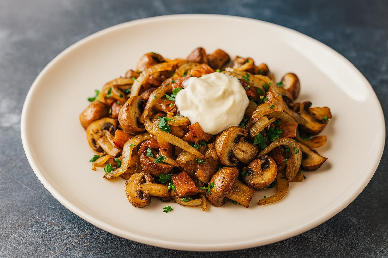 Zwiebeln mit Gewürzsalz und Pfeffermix würzen und mit der Petersilie vermengen, anschließend zu den Champignons in die Pfanne geben und kräftig durchschwenken. Pilzpfanne auf zwei Tellern anrichten und jeweils mit einem Klecks Crème fraîche toppen.