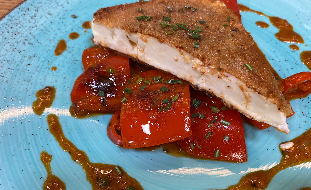 Fetaschnitzel mit geschmorter Paprika