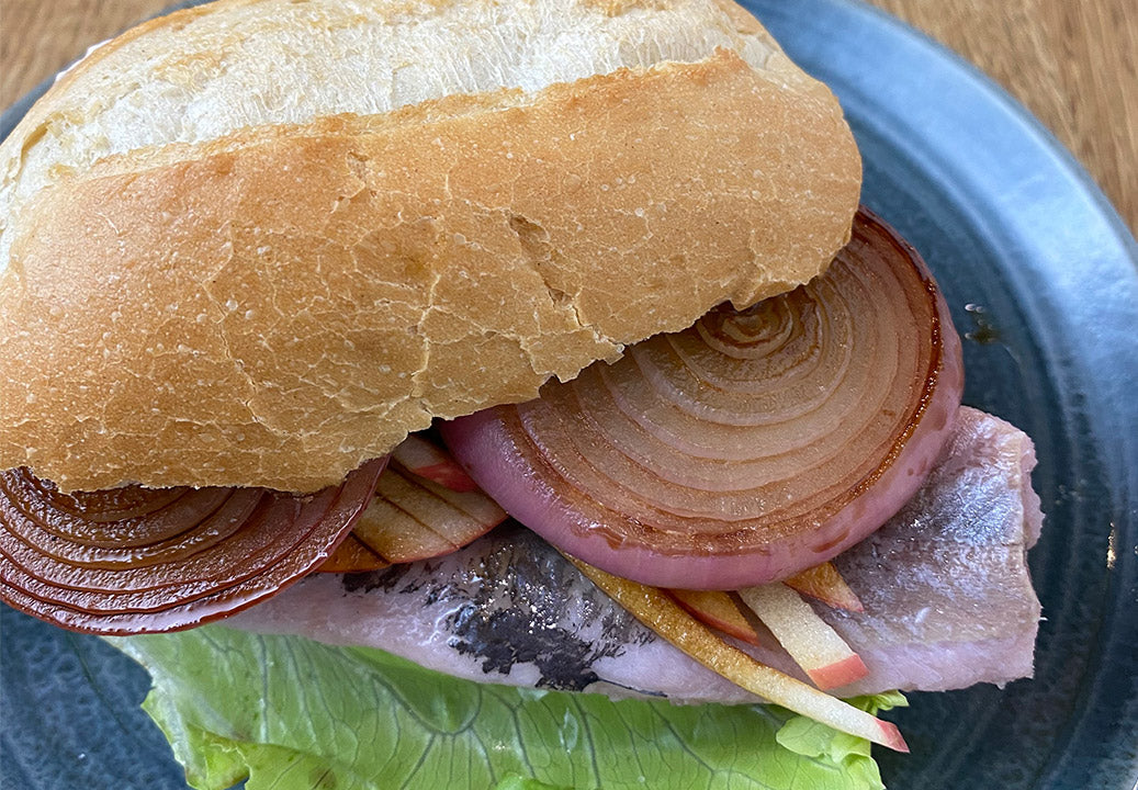 Zuerst ein Salatblatt, dann den Matjes auf das Brötchen legen. 2-3 Scheiben Apfel in dünne Stifte schneiden und auf den Matjes legen.