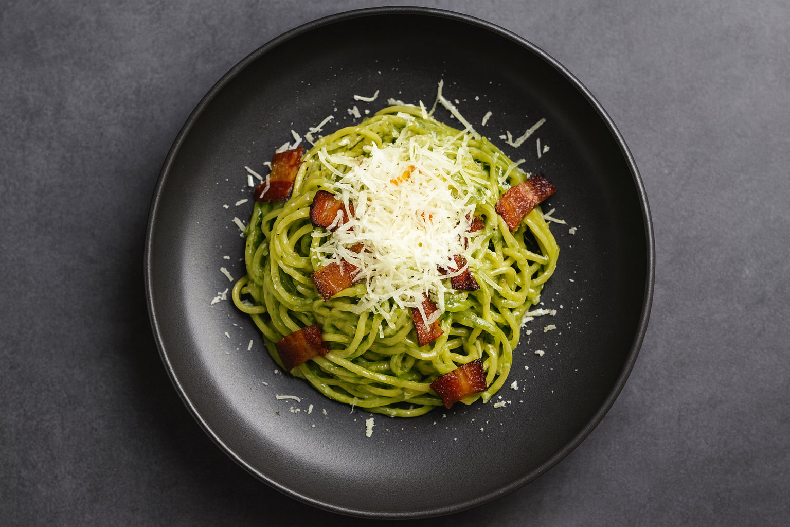 Erst eine Kelle Nudelkochwasser in die Spinat-Ei-Mischung geben und verrühren. Danach die gegarten Spaghetti unterheben. Pasta samt Sauce in die heiße Pfanne geben, nach Bedarf etwas mehr Nudelkochwasser zufügen. Alles unter Hitzezufuhr kurz verrühren, bis die Sauce anzieht und an der Pasta haftet. Carbonara auf zwei Tellern anrichten, Guanciale jeweils gleichmäßig darauf verteilen und mit fein geriebenem Parmesan bestreuen.