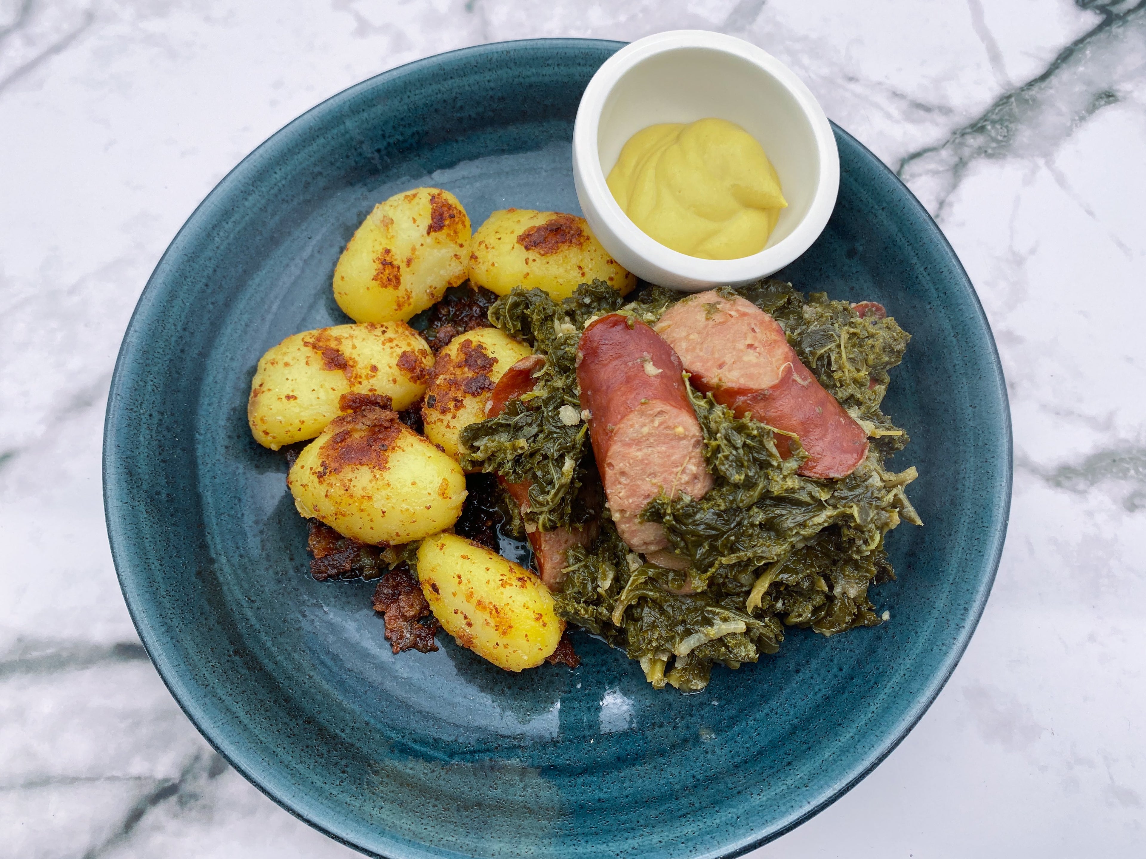 Haferflocken zum Grünkohl geben und gut vermengen. Grünkohl und Würste zusammen mit den Kartoffeln auf Tellern anrichten und Senf dazureichen