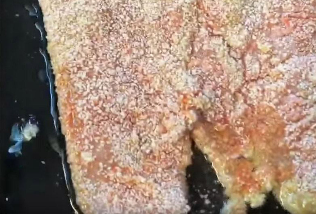 Hähnchenfilet platt klopfen. Das Hähnchen dann von beiden Seiten leicht salzen und in gekaufter Chilisauce marinieren.