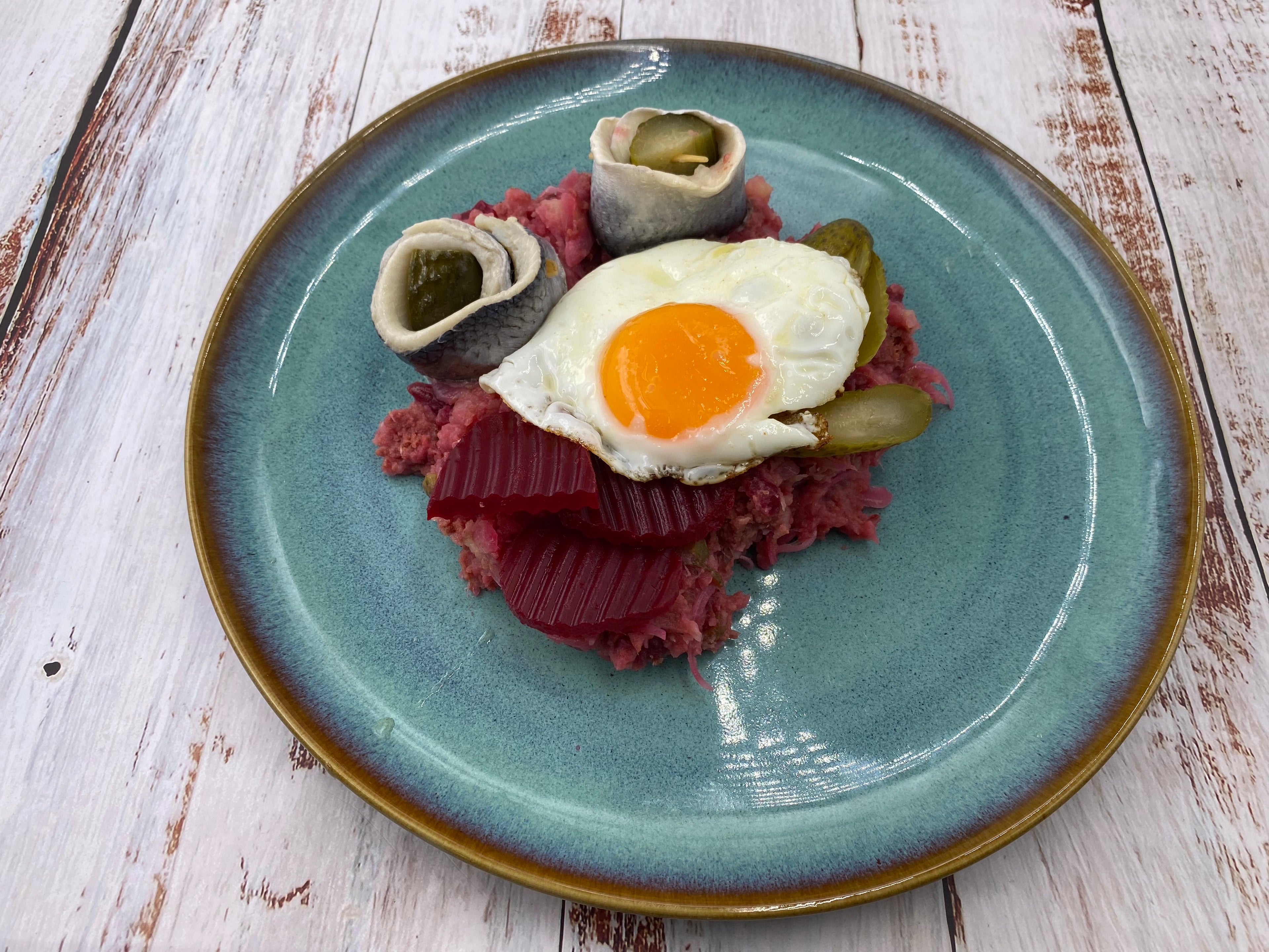 Kartoffeln abgießen und kurz ausdämpfen lassen. Anschließend Kartoffeln zurück in den Topf geben und mit einem Kartoffelstampfer grob stampfen. Kartoffelstampf und die Hälfte des Rote-Bete-Suds zum Corned Beef geben. Kräftig mit Salz und Pfeffer würzen. Alles nur kurz miteinander verrühren, damit das Labskaus stückig bleibt. Mit Gurkensud abschmecken.