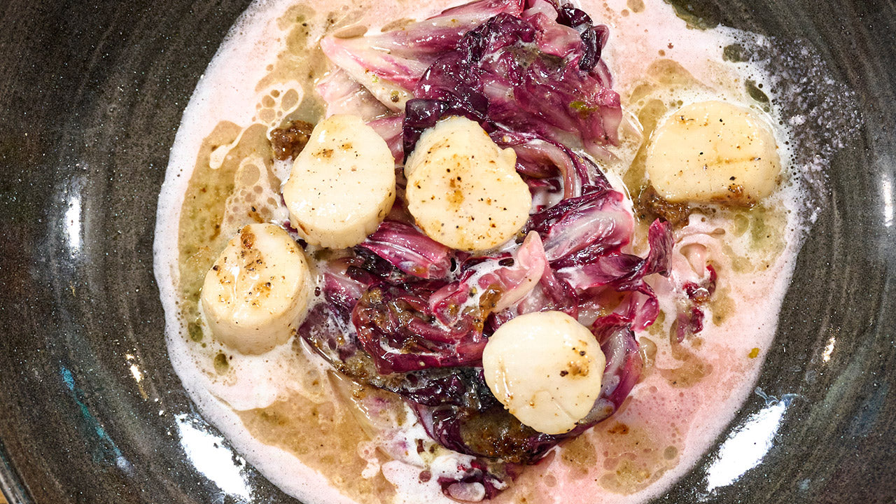Radicchio mit dem Sud aus der Pfanne und den Jakobsmuscheln sowie der gerösteten Butter anrichten.