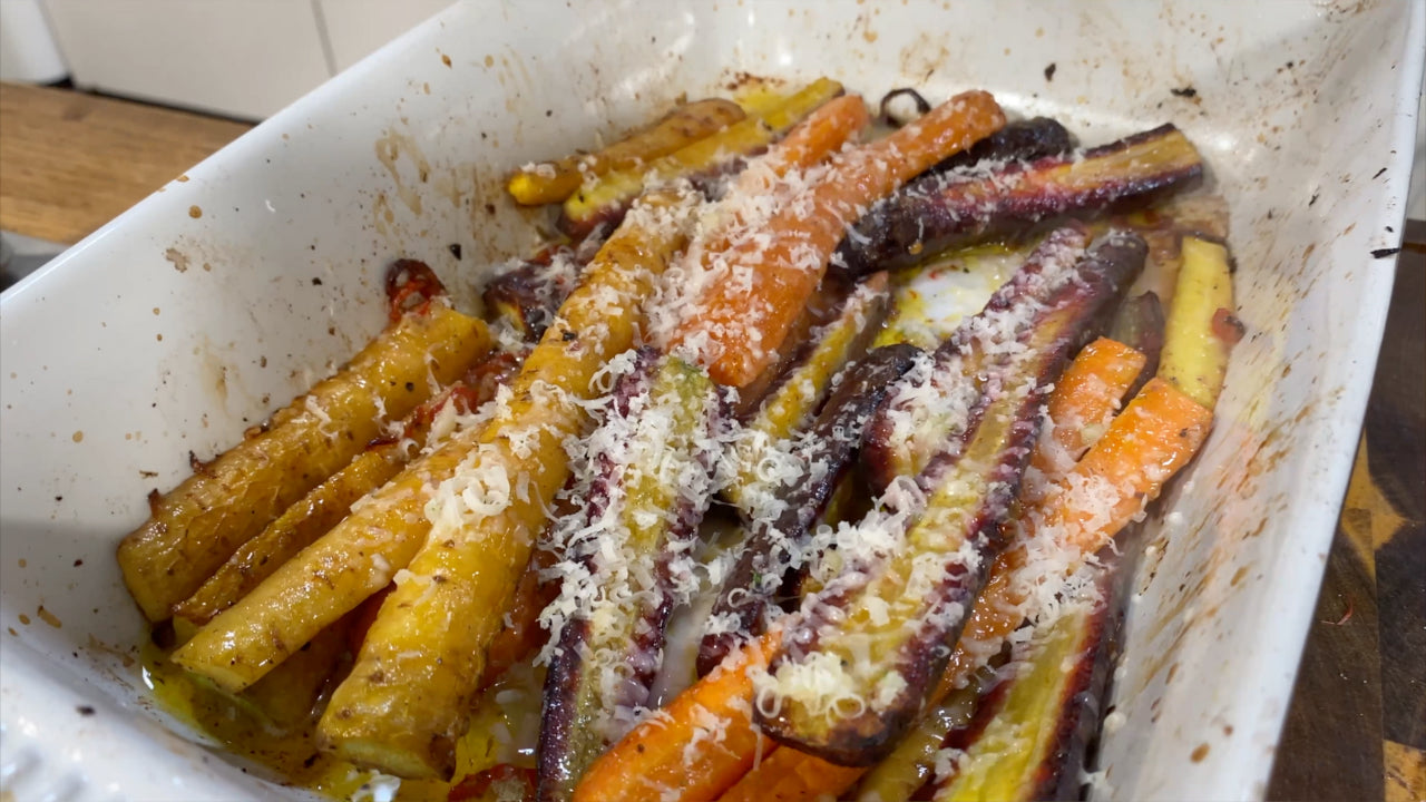 Karotten aus dem Ofen nehmen. Den Saft der Limette über dem Karottengemüse auspressen und frisch geriebenen Parmesankäse darüberstreuen. Amarettini zerbröseln und ebenfalls auf den Karotten verteilen. Karottengemüse auf Tellern anrichten.