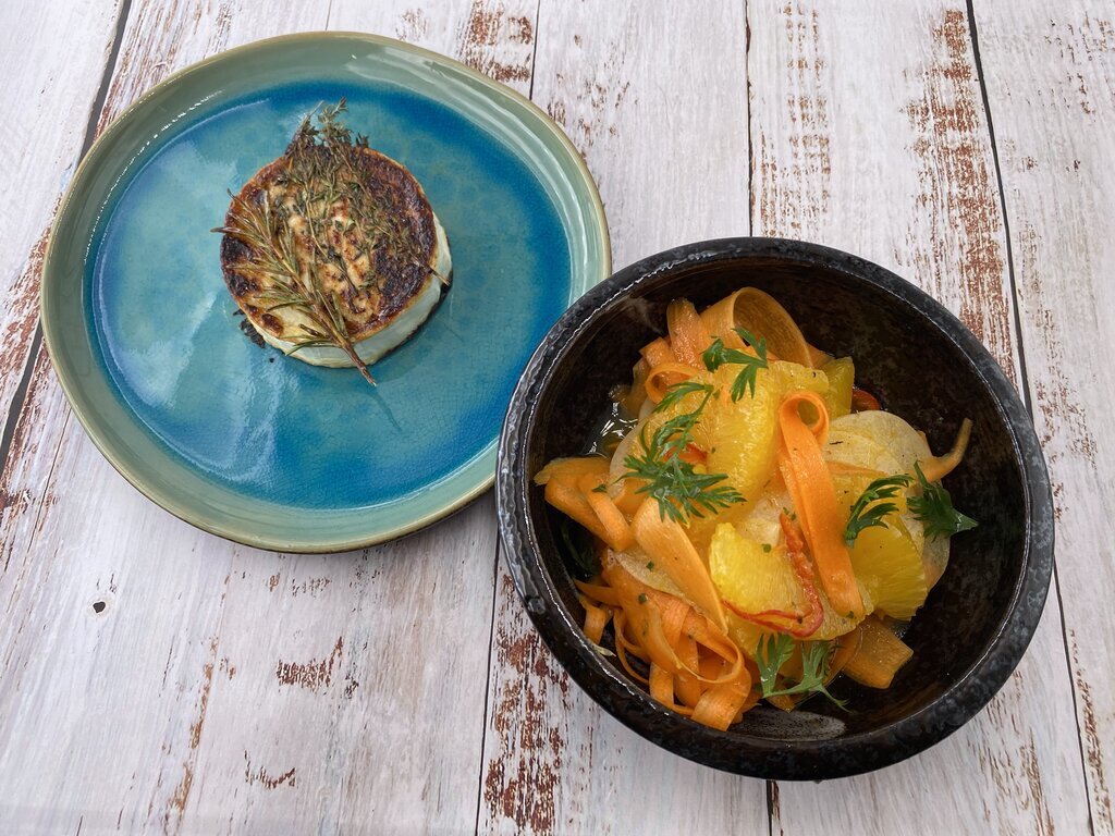 Die Ziegenkäsescheiben aus der Pfanne nehmen und auf zwei weiteren Tellern anrichten.