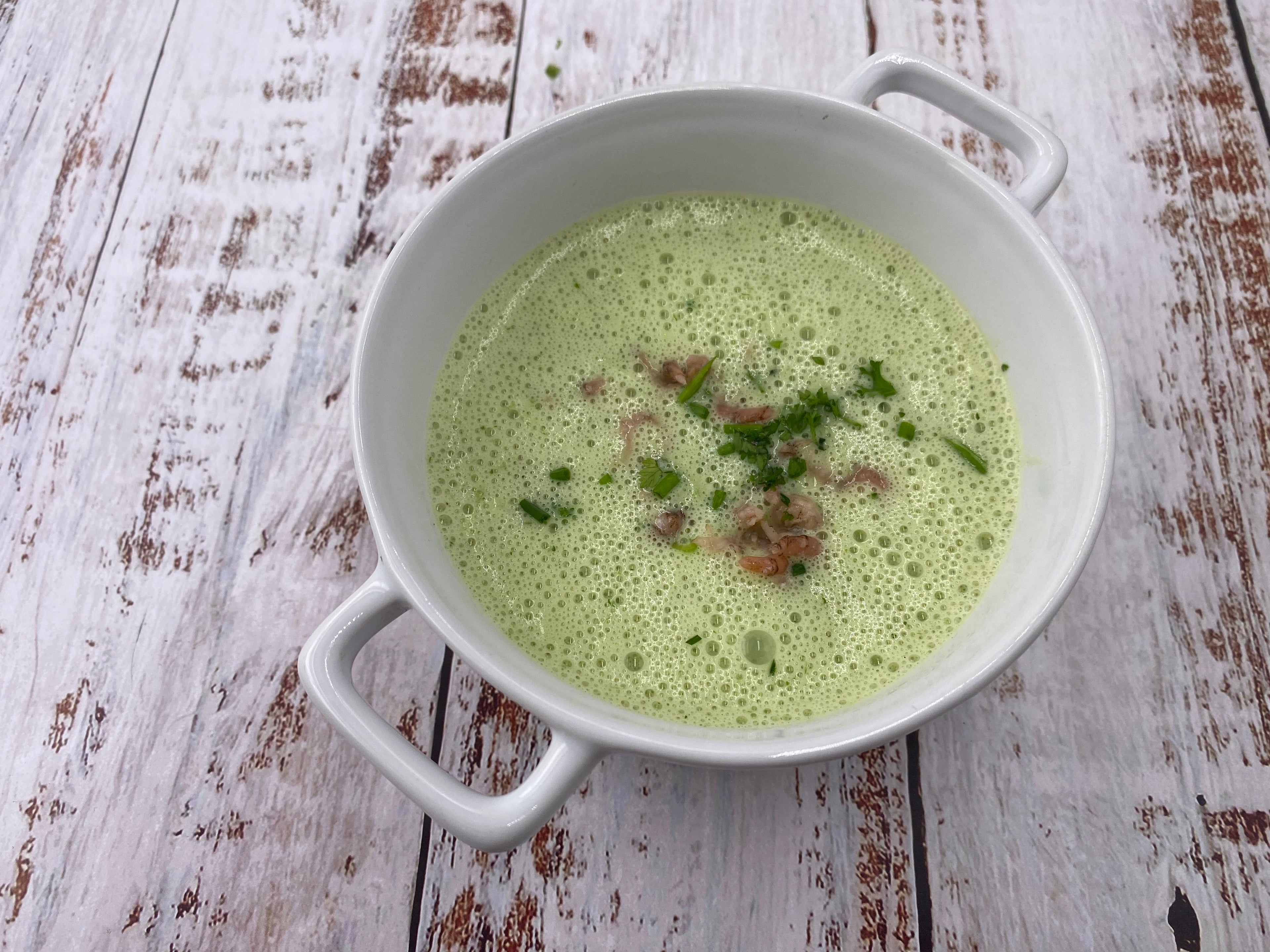 In der Zwischenzeit die Kräuter fein hacken. Wenn die Kartoffeln gar sind, Sahne dazugießen, noch mal aufkochen lassen, Hälfte Kräuter dazugeben und alles mit einen Stabmixer fein pürieren, dann restliche Kräuter dazugeben und weitermixen. Suppe anrichten und ggf. mit noch ein paar Kräutern garnieren. Nach Wunsch mit Krabben servieren.