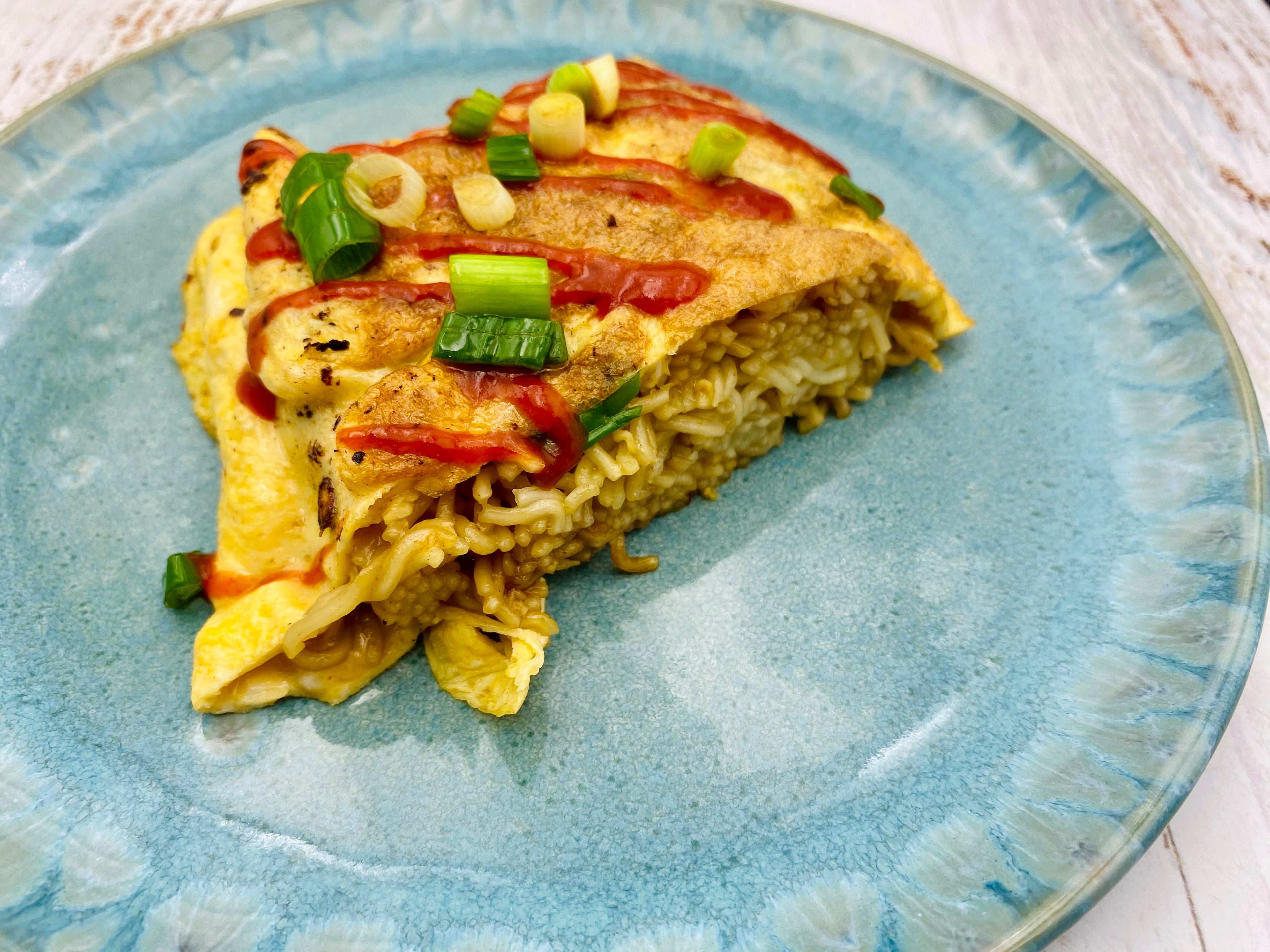 Knoblauch-Ramen-Omelett auf Tellern anrichten und vorm Servieren nach Wunsch mit Chilisauce beträufeln.