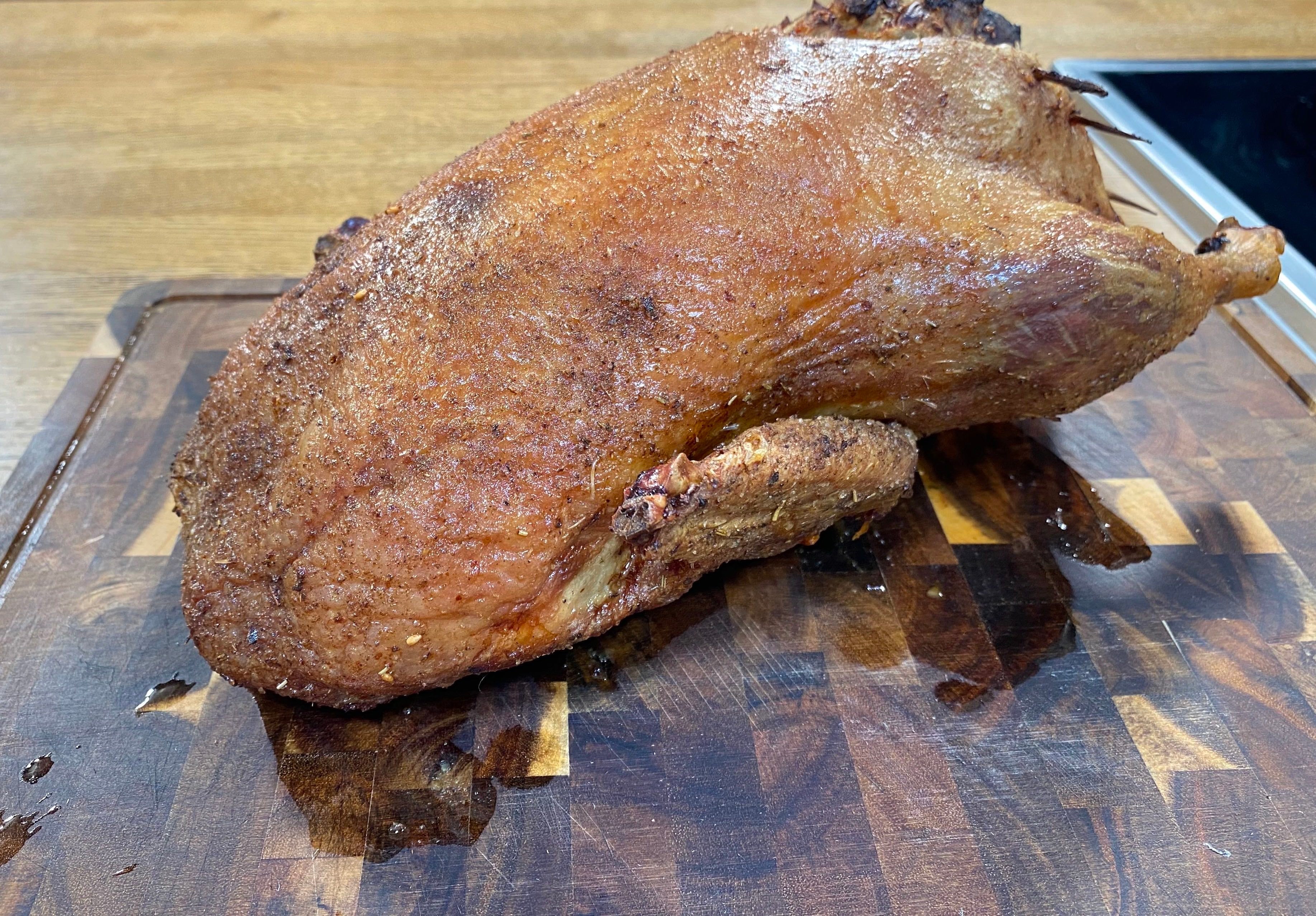Ente im heißen Ofen bei 165 °C Umluft ca. 90 Minuten garen, die Ente zwischendurch immer wieder mit dem ausgetretenem Fett bestreichen. Dann die Ofentemperatur auf 220 °C Umluft erhöhen und die Ente ca. 10 Minuten weitergaren.