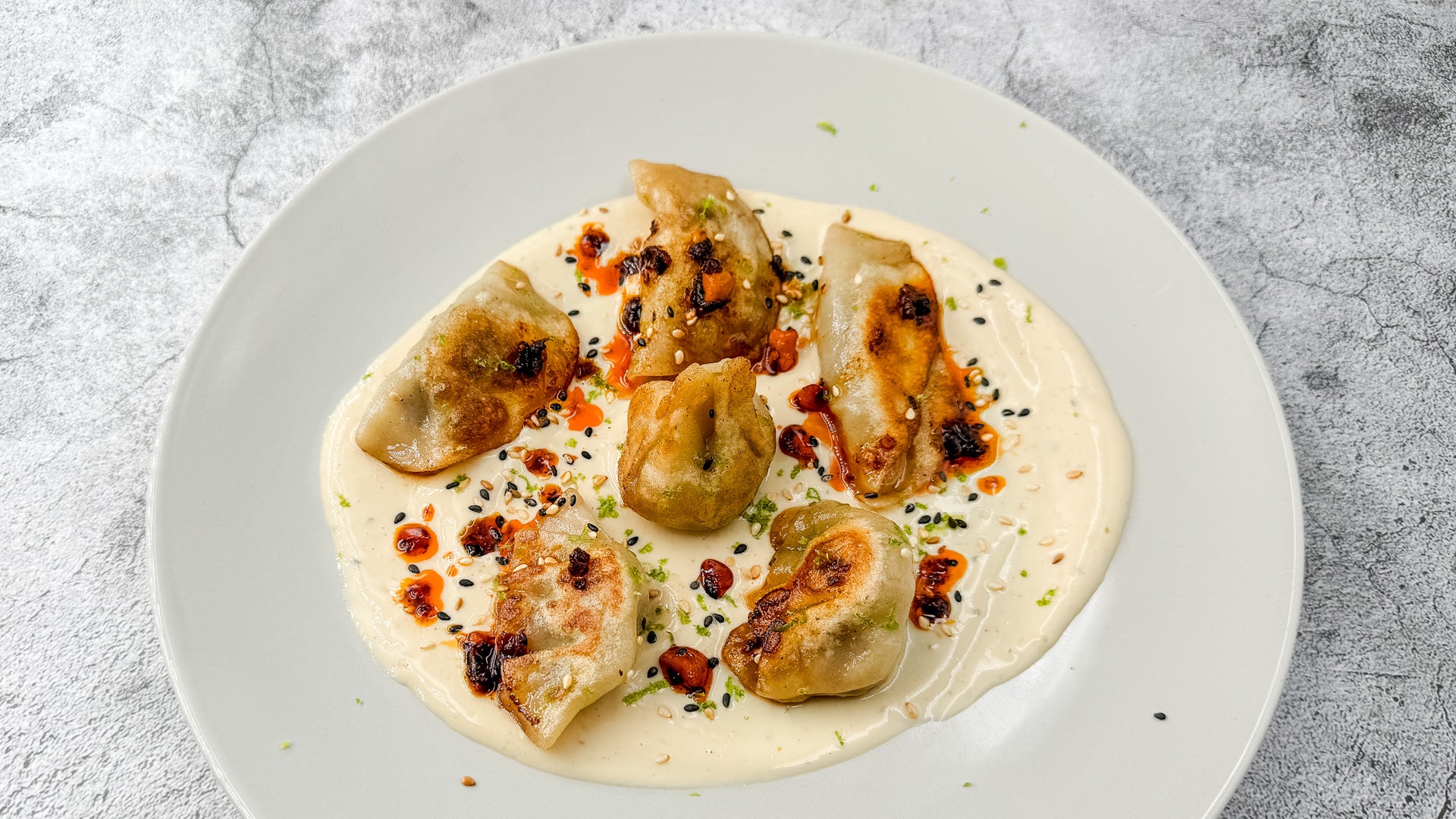 1 EL Sesamöl in einer Pfanne erhitzen und die Teigtaschen aus dem Wasser heben. Teigtaschen im heißen Sesamöl goldbraun anbraten. Den Dip auf zwei Tellern verteilen, die Teigtaschen darauf platzieren und mit frisch geriebener Limettenschale, Sesam und je 1 TL Crispy Chili-Öl garnieren.