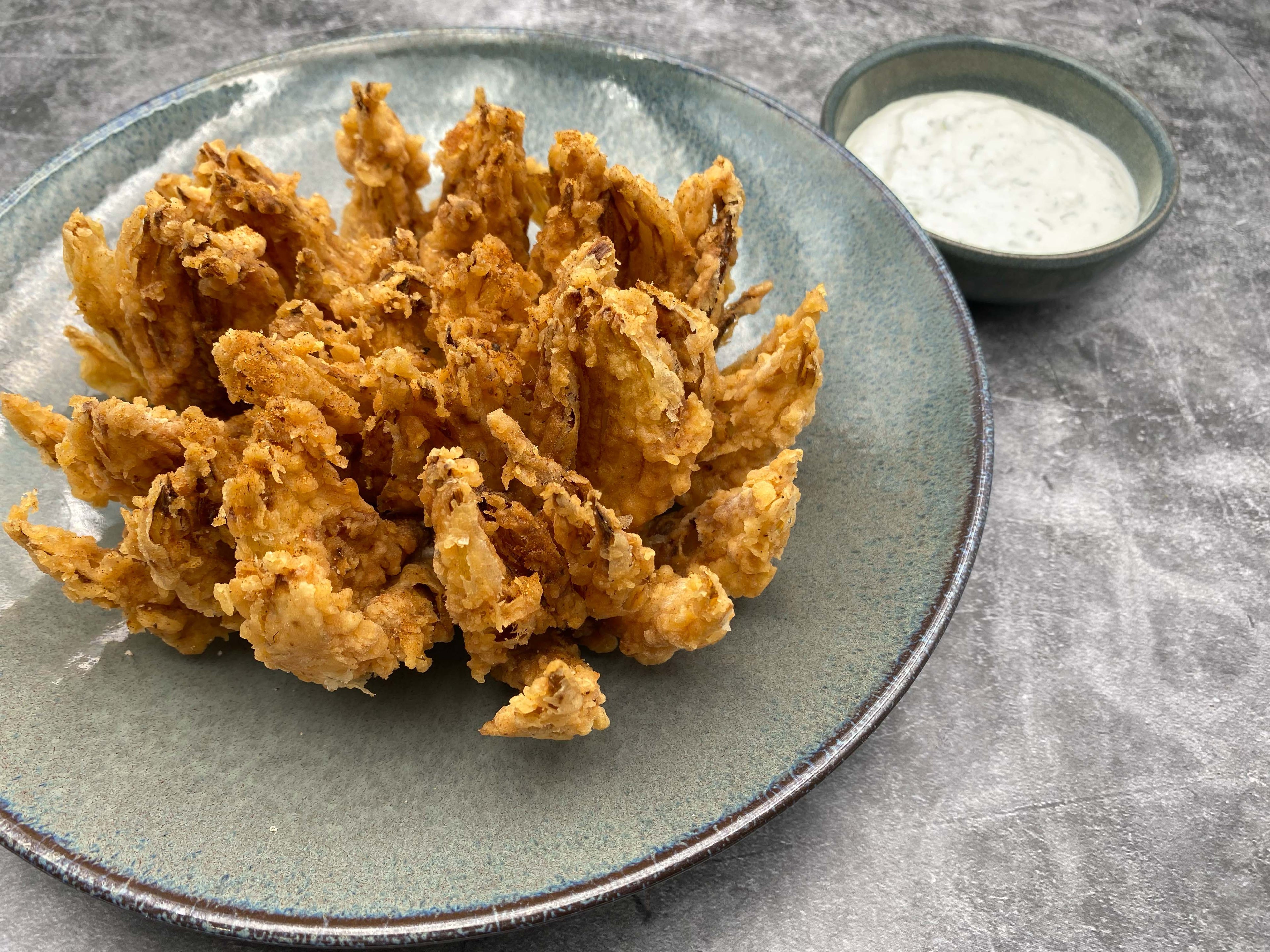 Die mehlierte Zwiebel mit der Öffnung nach unten in einen Topf mit heißem Rapsöl (ca. 170 °C) setzen und für ca. 10-12 Min. darin goldbraun und knusprig frittieren. Die Zwiebel zwischendurch wenden. Zwiebel auf einem Küchenpapier abtropfen lassen. Die Zwiebel vorm Servieren nachwürzen und den Dip dazureichen -