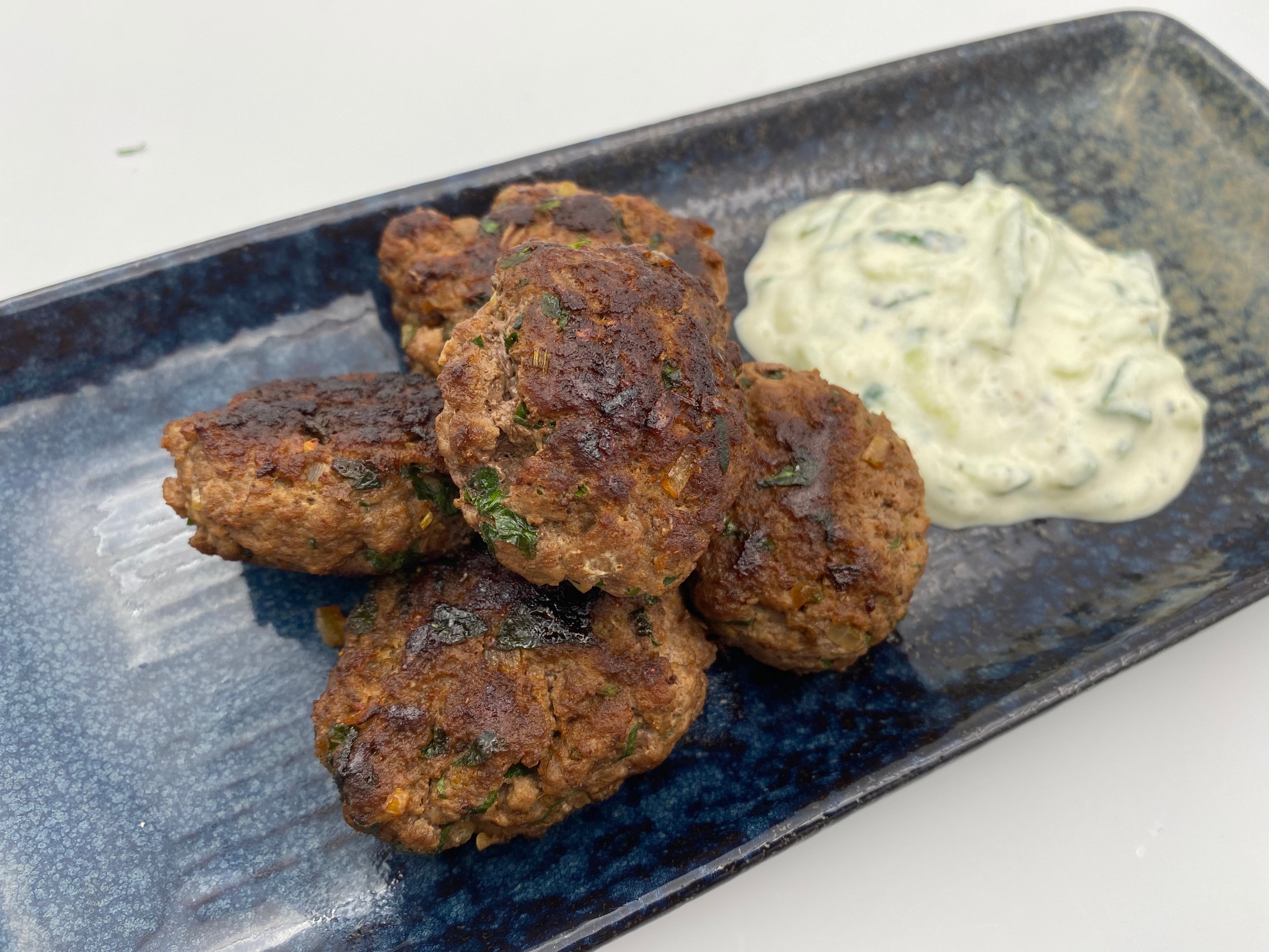 Fladenbrot kurz aufbacken und anschließend aufschneiden. Joghurt-Gurkendip auf der unteren Hälfte verstreichen. Die Köfte darauflegen und das Brot zuklappen