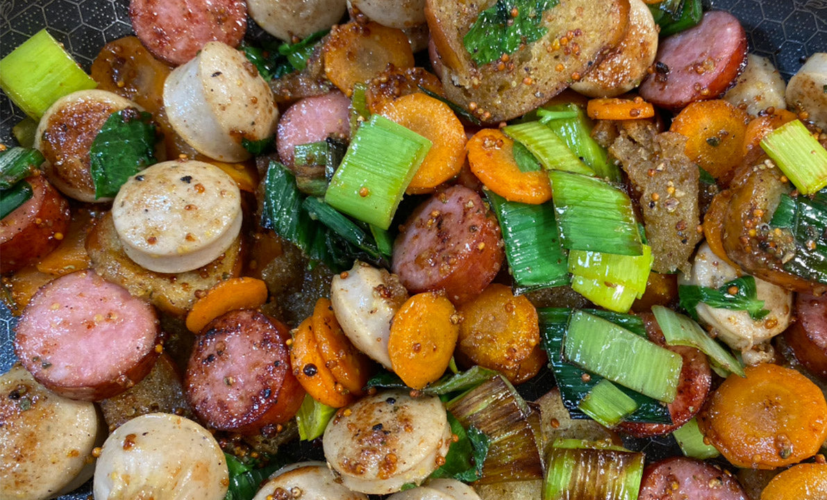 Währenddessen die Bratwurst, die Krakauer und den Lauch in kleine Stücke schneiden, mit in die Pfanne geben und für weitere 3-4 Min bei hoher Hitze scharf anbraten