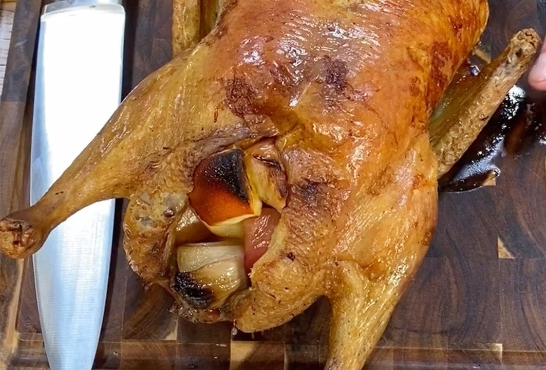 Die Ente aus der Lake nehmen, abtropfen lassen, die Lake wegschütten und die Ente auf ein Brett setzen. Zwiebeln, Äpfel und Orange in grobe Stücke schneiden, mit den Rosinen mischen und die Ente damit füllen