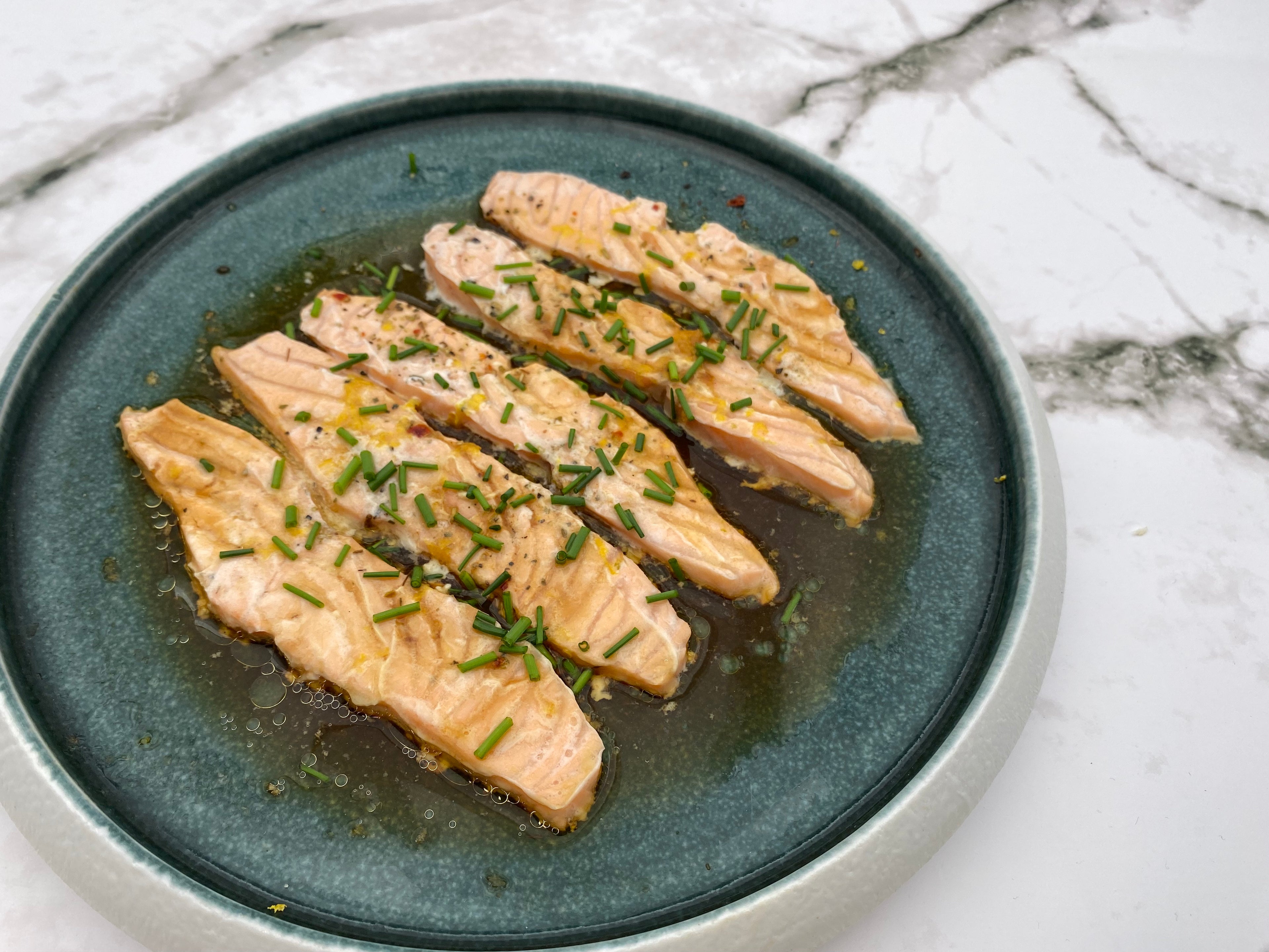 Teller aus dem Ofen nehmen und die Frischhaltefolie entfernen. Lachs mit dem Schnittlauch garnieren