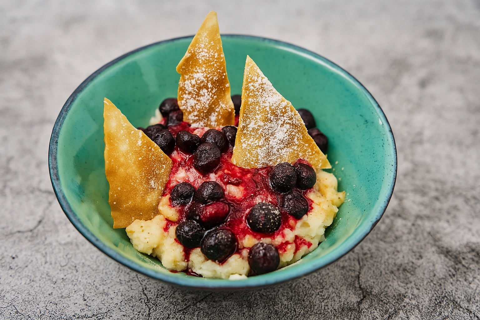 Währenddessen Heidelbeeren mit 1 EL Zucker in einer Pfanne bei mittlerer Hitze karamellisieren. Feinen Abrieb und Saft von Orange und Zitrone sowie Butter hinzufügen. Kurz schwenken, bis die Butter geschmolzen ist. Pfanne vom Herd nehmen. -