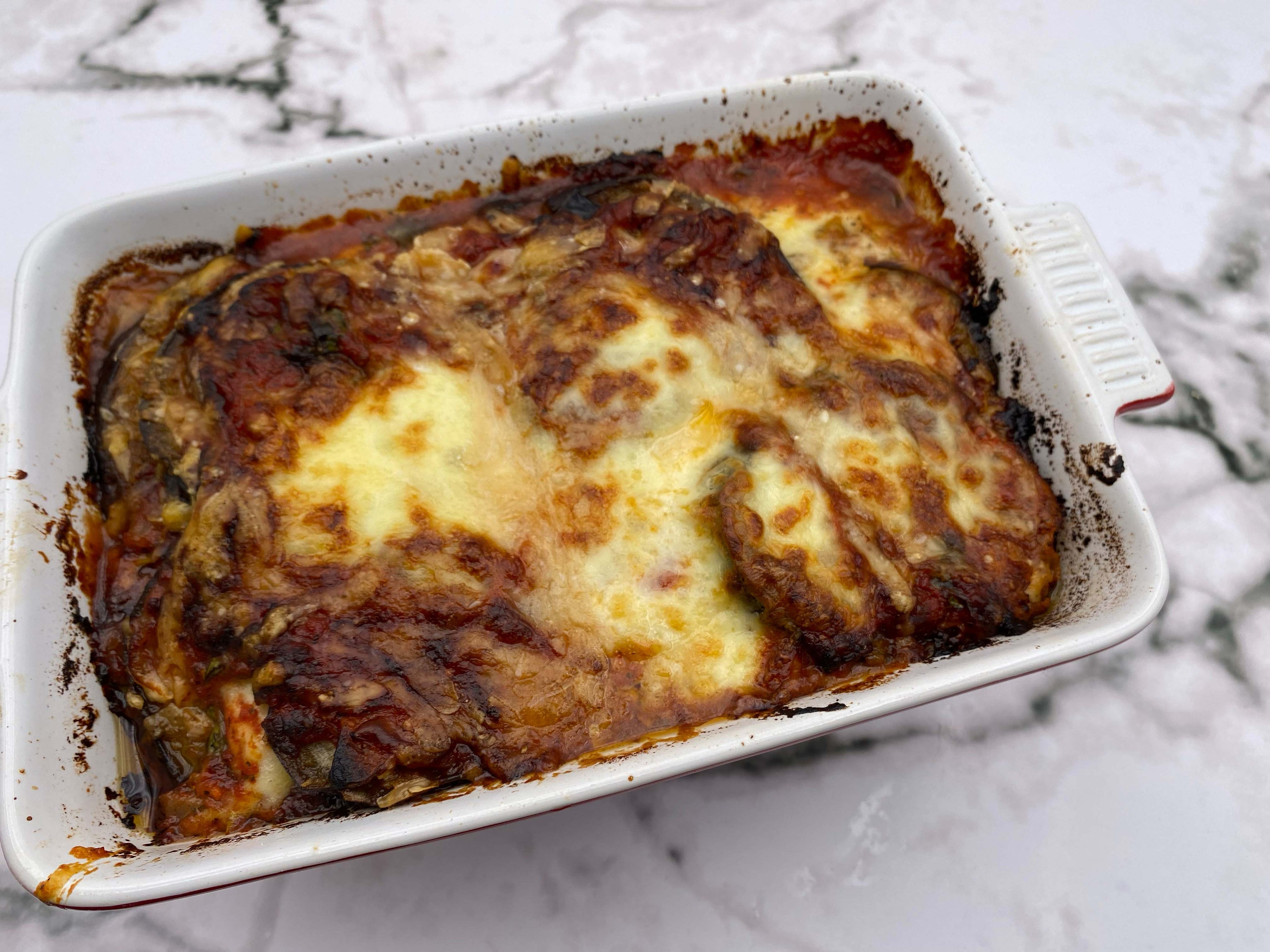 Im Wechsel Aubergine, Tomatensauce, Mozzarella und Parmesan in einer Auflaufform schichten, bis alle Zutaten aufgebraucht sind. Die Auflaufform für ca. 25 Min. in den heißen Ofen geben.