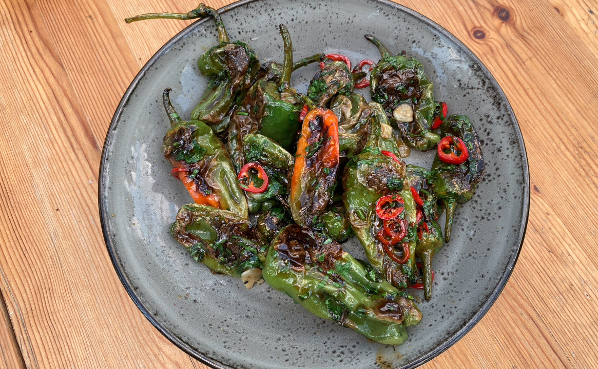 Hitzebeständige Pfanne auf den heißen Grill stellen und aufheizen. Olivenöl in die heiße Pfanne geben und Pimientos ca. 10 Minuten darin braten. Nach 3 Minuten die Pimientos mit Gewürzsalz würzen und mit einer Fleischgabel anpieksen, damit sie nicht aufplatzen. Zwischendurch immer wieder in der Pfanne schwenken
