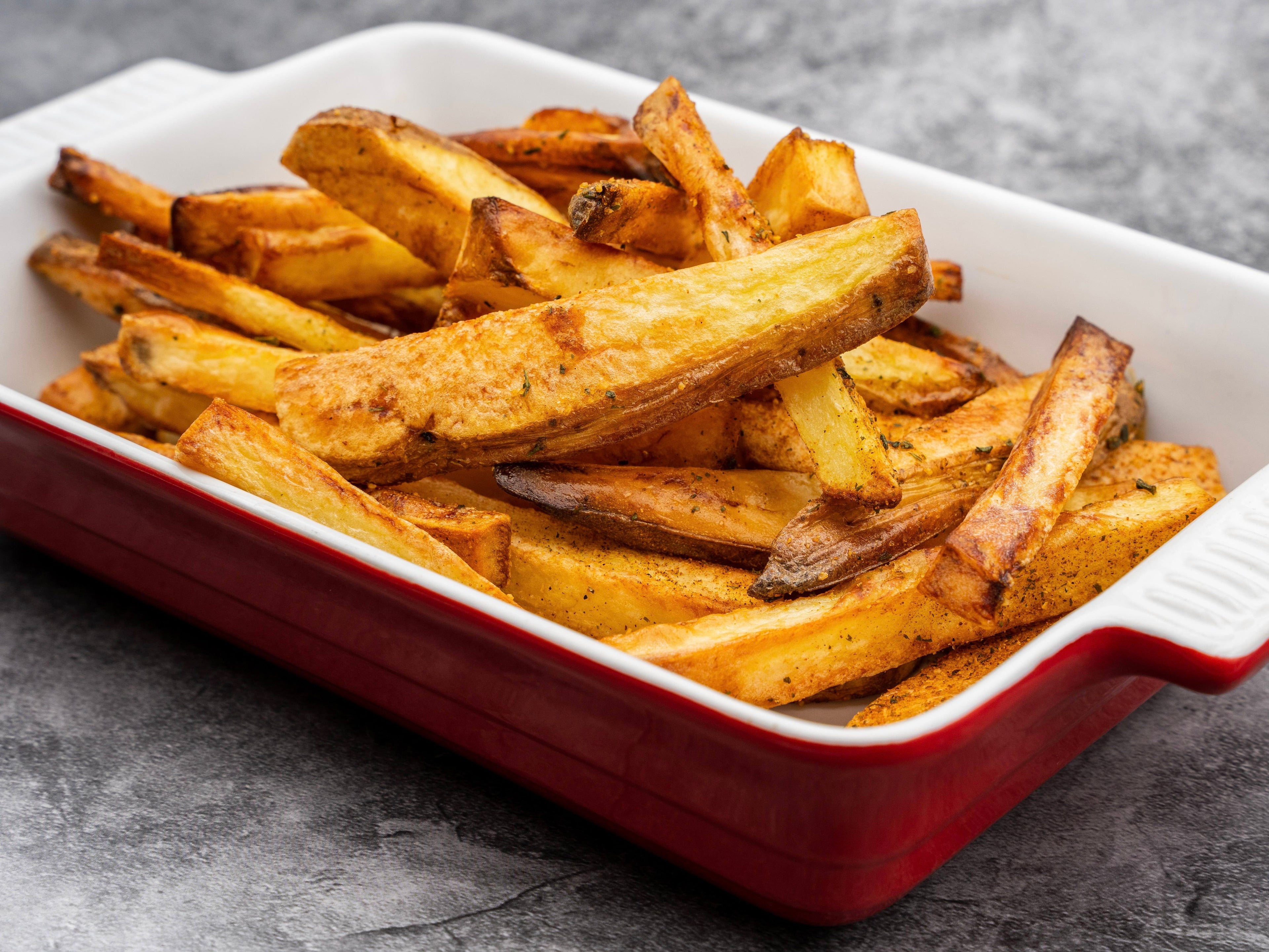 Pommes aus dem Ofen holen, mit Kartoffelgewürz würzen, auf Teller geben und die selbstgemachte Mayonnaise zum Dippen dazureichen -