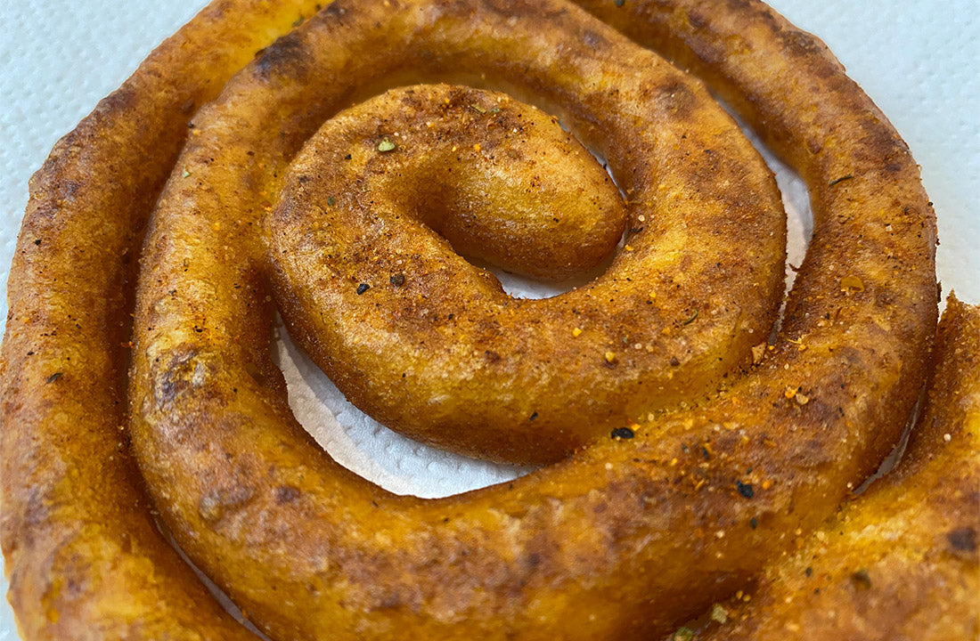 Die Pommes Schnecken auf Küchenkrepp abtropfen und mit HSN Gewürzmix bestreuen.