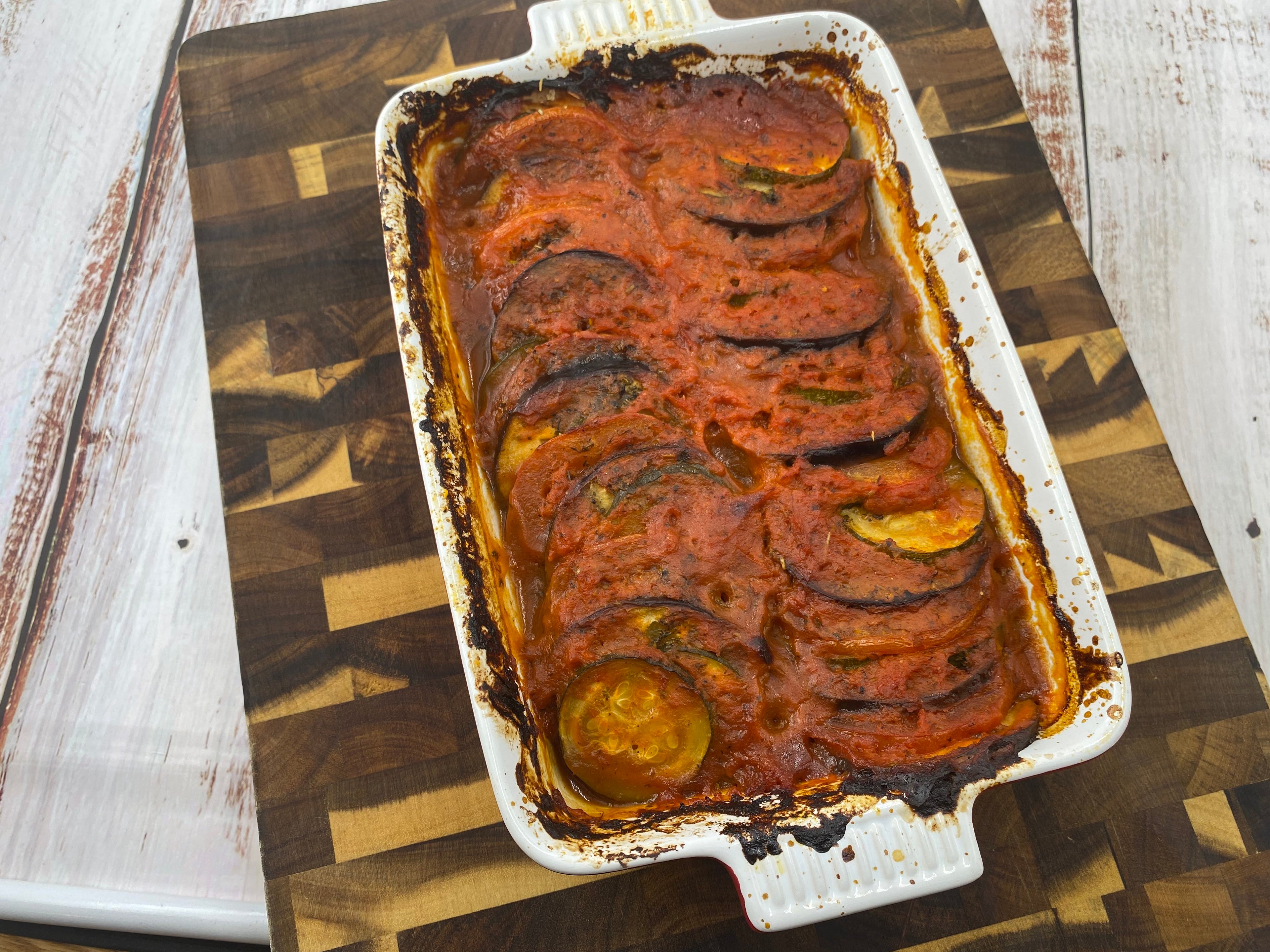 Ca. 2/3 der Sauce auf dem Boden einer Auflaufform verstreichen. Dann die Form im Wechsel mit einer Scheibe Aubergine, zwei Scheiben Zucchini und einer Scheibe Tomate auslegen, bis die Auflaufform vollständig gefüllt ist. Gemüse mit Gewürzsalz und Kräuter der Provence würzen und 2-3 EL Olivenöl darüber verteilen. Restliche Sauce auf das Gemüse geben und verstreichen. Dann das Gemüse mit einem Stück Backpapier abdecken und ca. 45 Minuten im heißen Backofen garen.