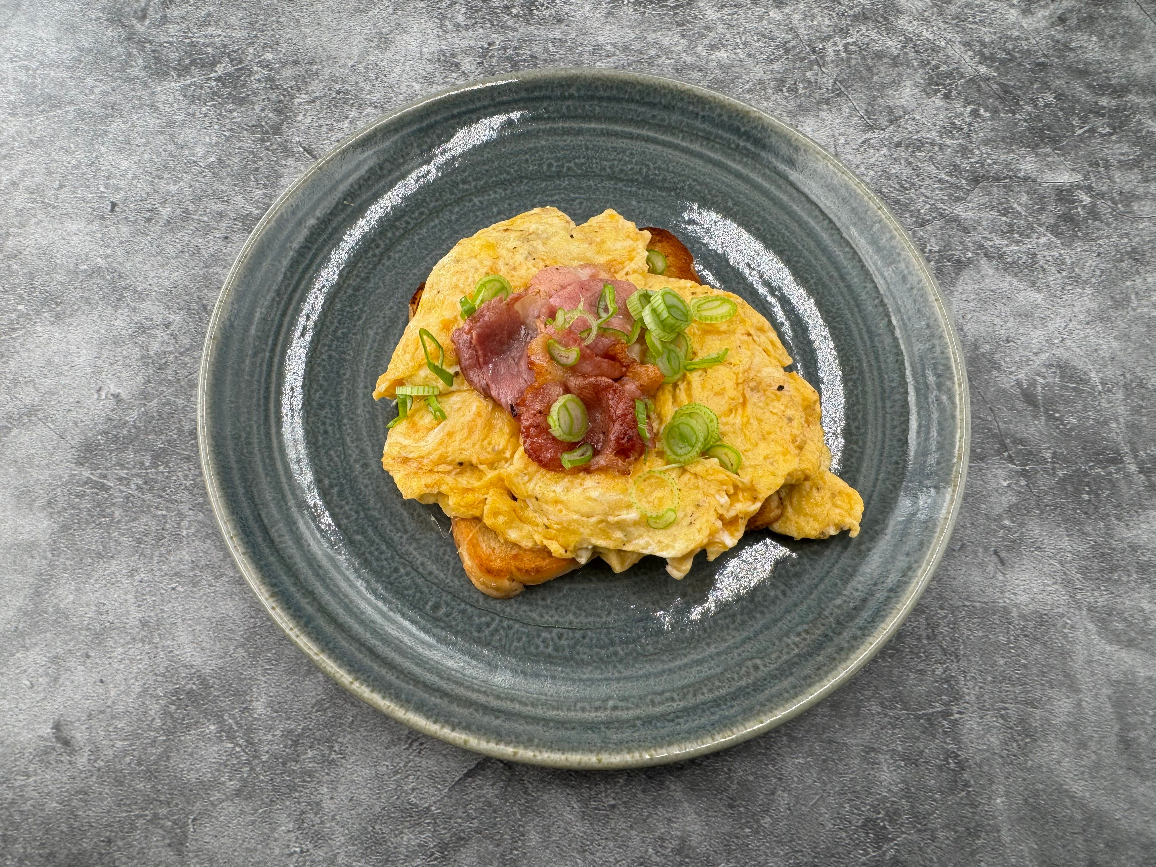 Toastbrotscheiben auf zwei Tellern anrichten. Jeweils etwas Rührei darauf anrichten und Speck daraufgeben. Frühlingszwiebeln in Ringe schneiden und auf den Broten verteilen.