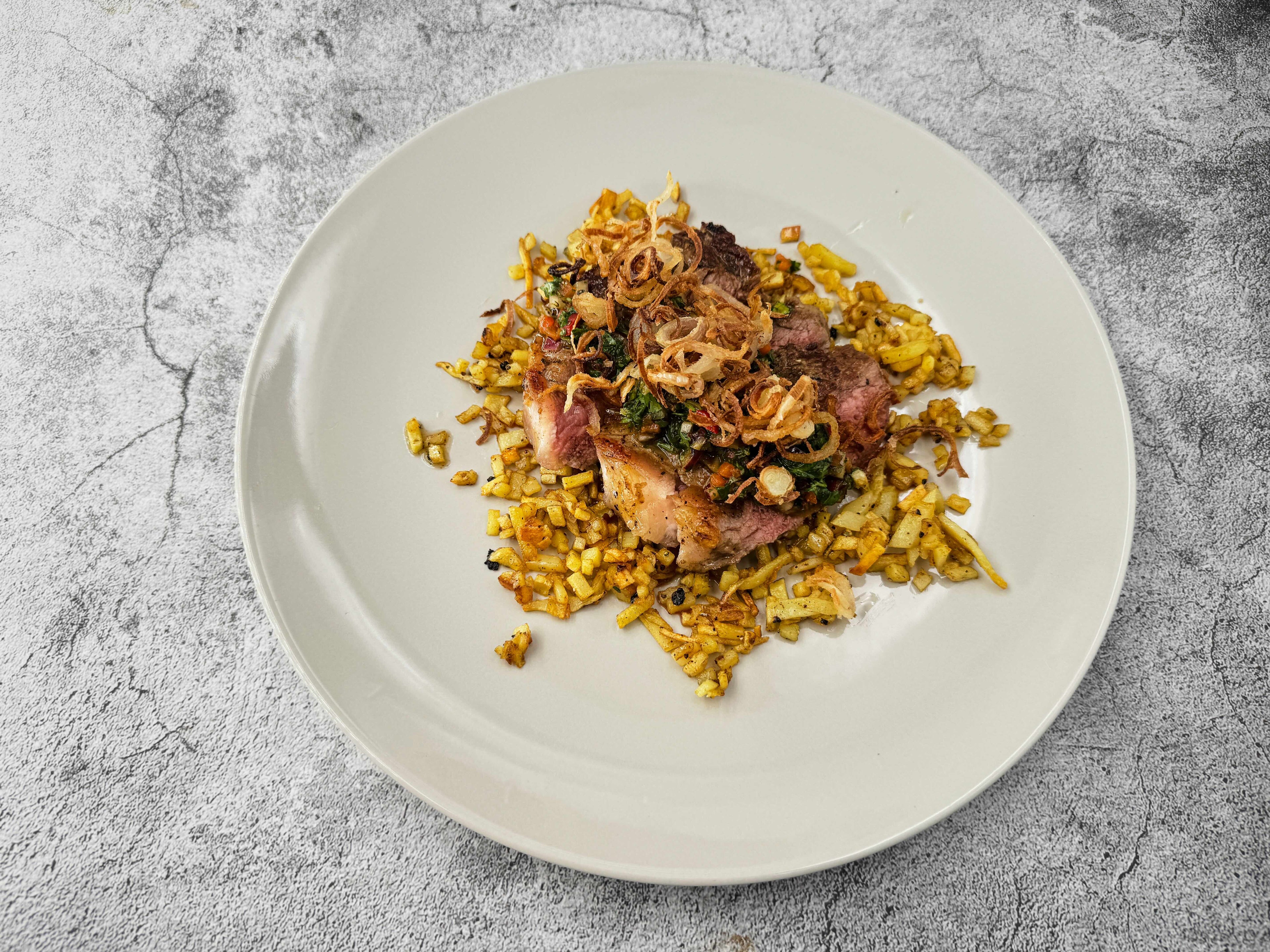 Anrichten die Kartoffelwürfel auf zwei Teller verteilen. Die Steaks darauf