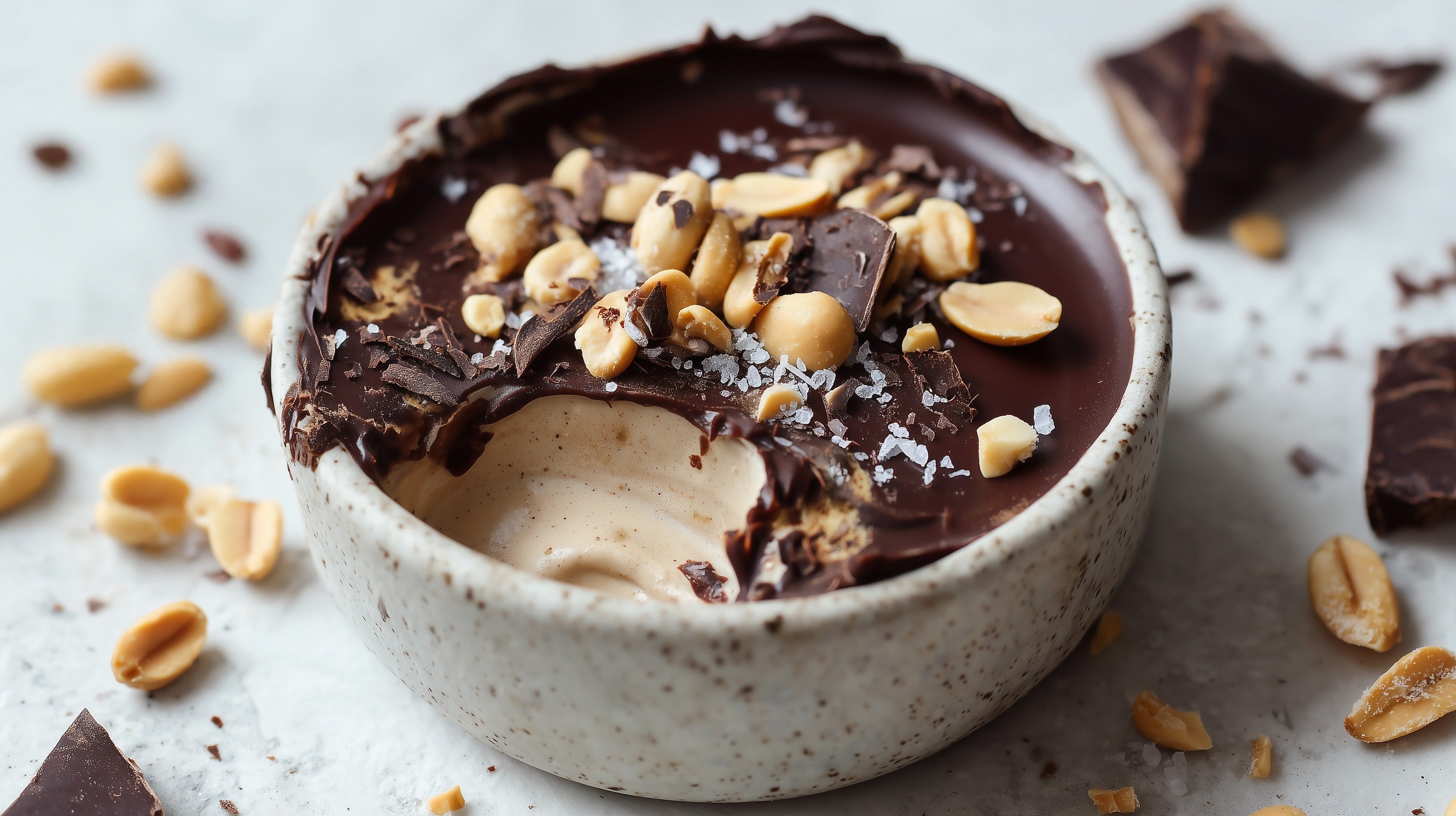 Griechischen Joghurt und Crème fraîche in einer Schüssel verrühren. Erdnussbutter mit 1 TL neutralem Öl verrühren, bis die Erdnussbutter cremig wird. Anschließend mit Honig und Nuss-Nougat-Creme vermengen. 2/3 der entstandenen Schoko-Nuss-Creme unter das Joghurt-Gemisch ziehen, bis ein Marmor-Effekt entsteht. -