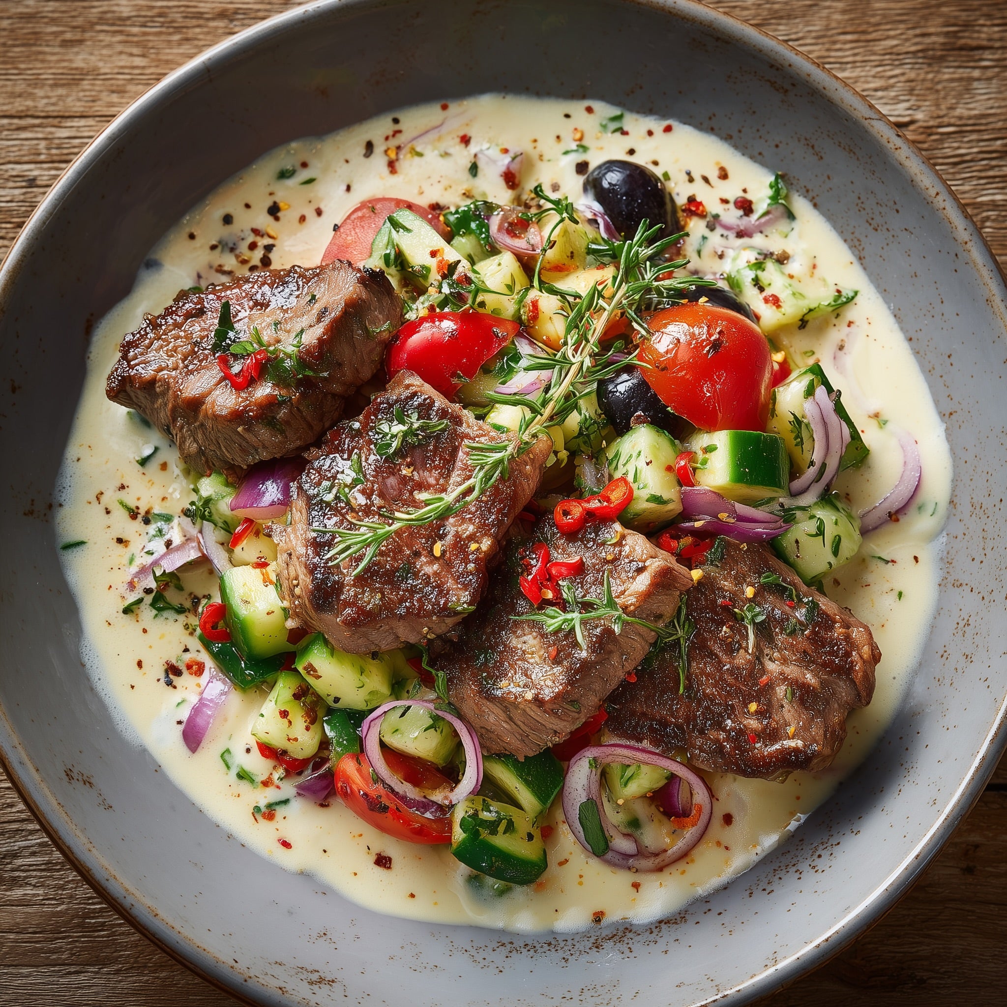 Gurke und Tomate in Würfel schneiden. Zwiebel in Scheiben schneiden. Gurke, Tomate und Zwiebel in eine Schüssel geben. Oliven und grob gezupften Thymian dazugeben. Mit Gewürzsalz und Pfeffer würzen. Olivenöl darübergießen.