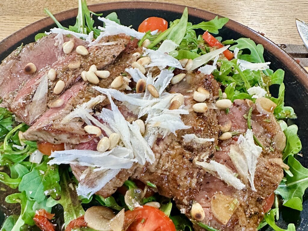 Steak schräg in Scheiben schneiden und die Fleischscheiben auf dem Salat verteilen. Dann die Rosmarin-Knoblauch-Butter auf dem Fleisch und Salat verteilen. Parmesan fein hobeln und darauf verteilen. Mit Gewürzsalz würzen und Pinienkerne darüberstreuen.