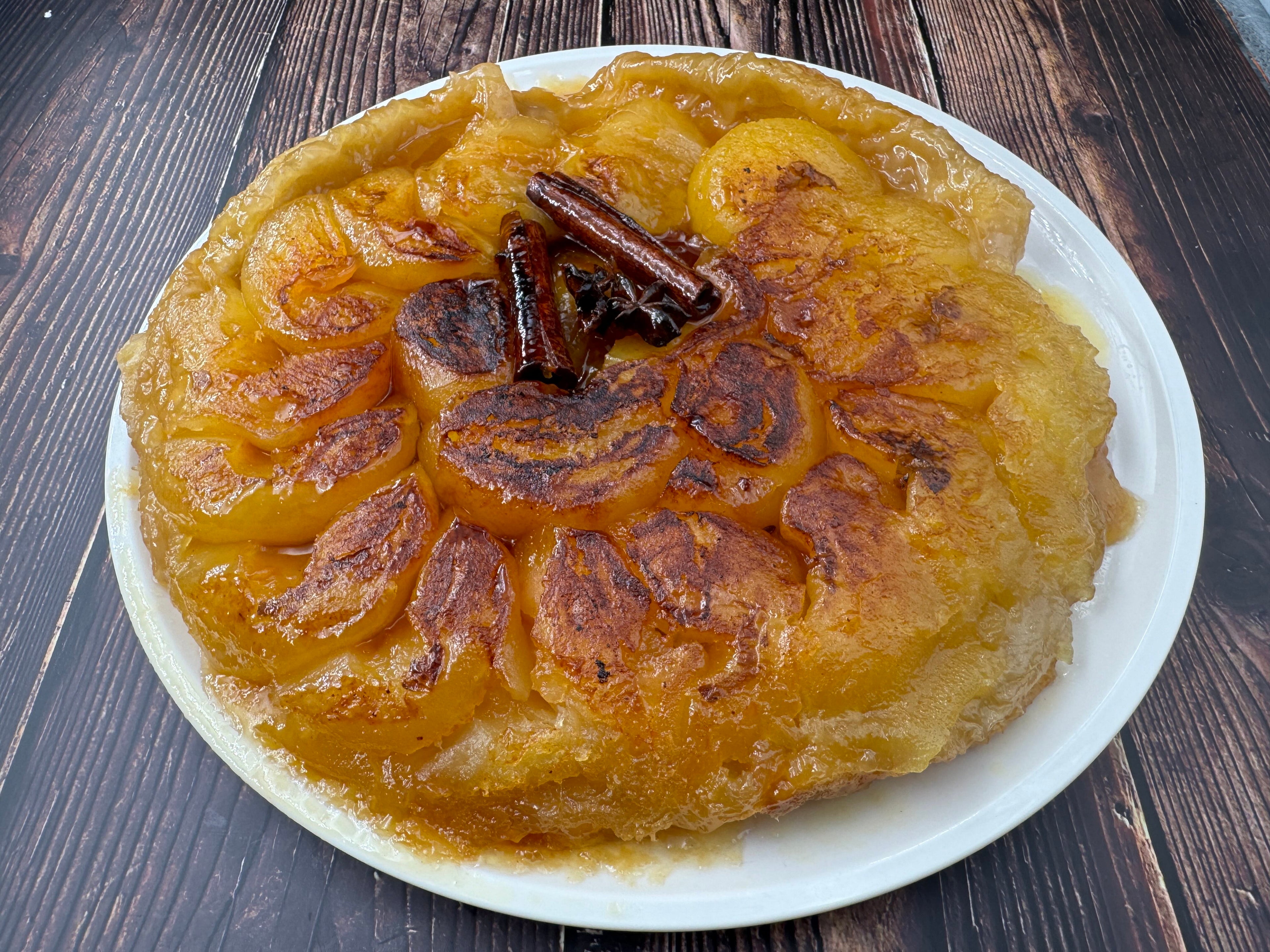 Tarte aus dem Ofen nehmen und auf dem Herd bei starker Hitze noch einmal karamellisieren lassen. Dann die Tarte von der Hitze nehmen, auf einen großen Teller stürzen und etwas abkühlen lassen.