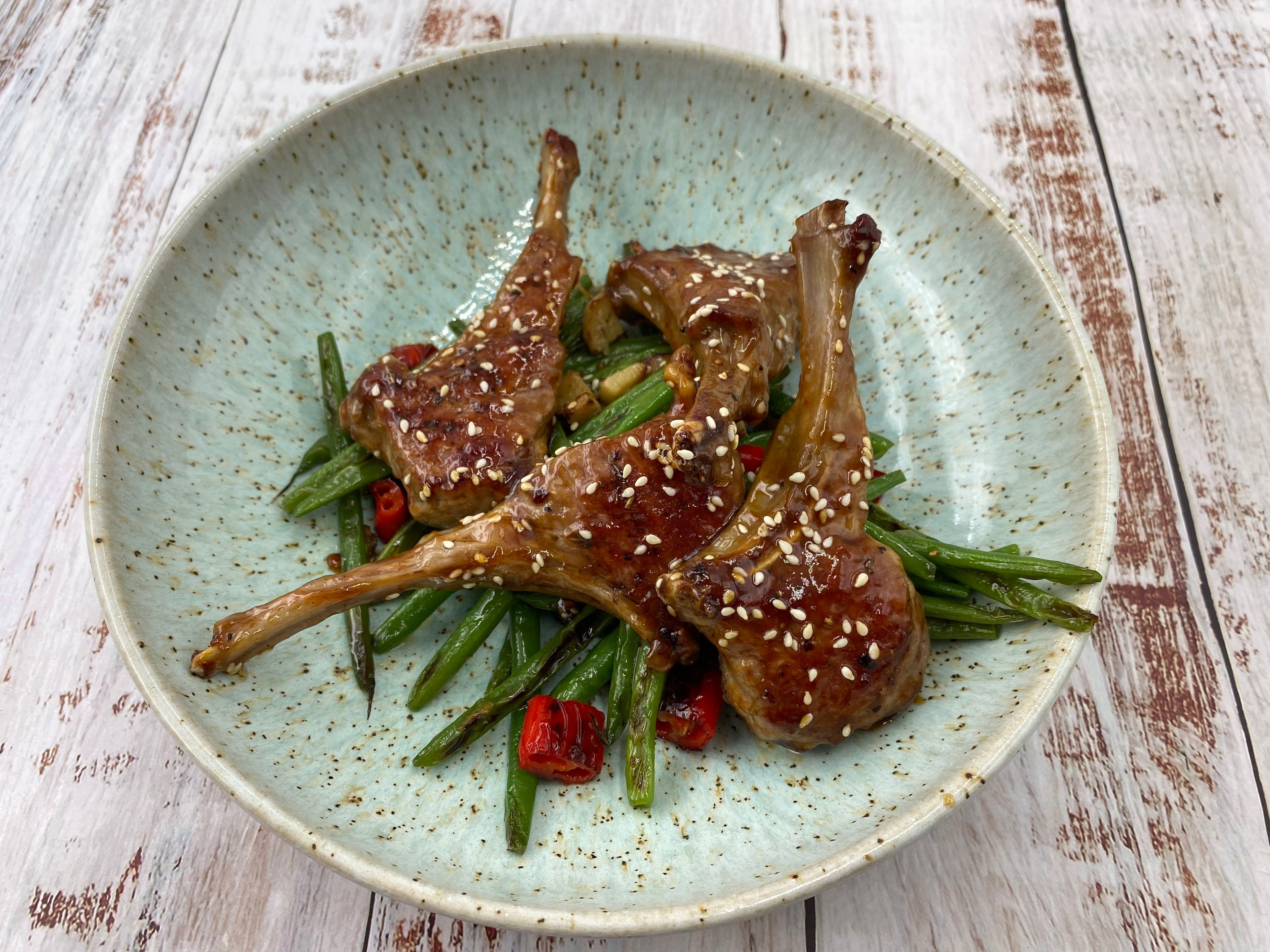 Fett aus der Fleischpfanne abgießen. Lammkoteletts mit Teriyaki Sauce ablöschen. Butter dazugeben und so lange glacieren, bis die Teriyaki Sauce fast vollständig eingekocht ist. Dann Sesam dazugeben, alles einmal durchschwenken und je fünf Stücke Lamm auf je einem Teller mit Bohnen anrichten.