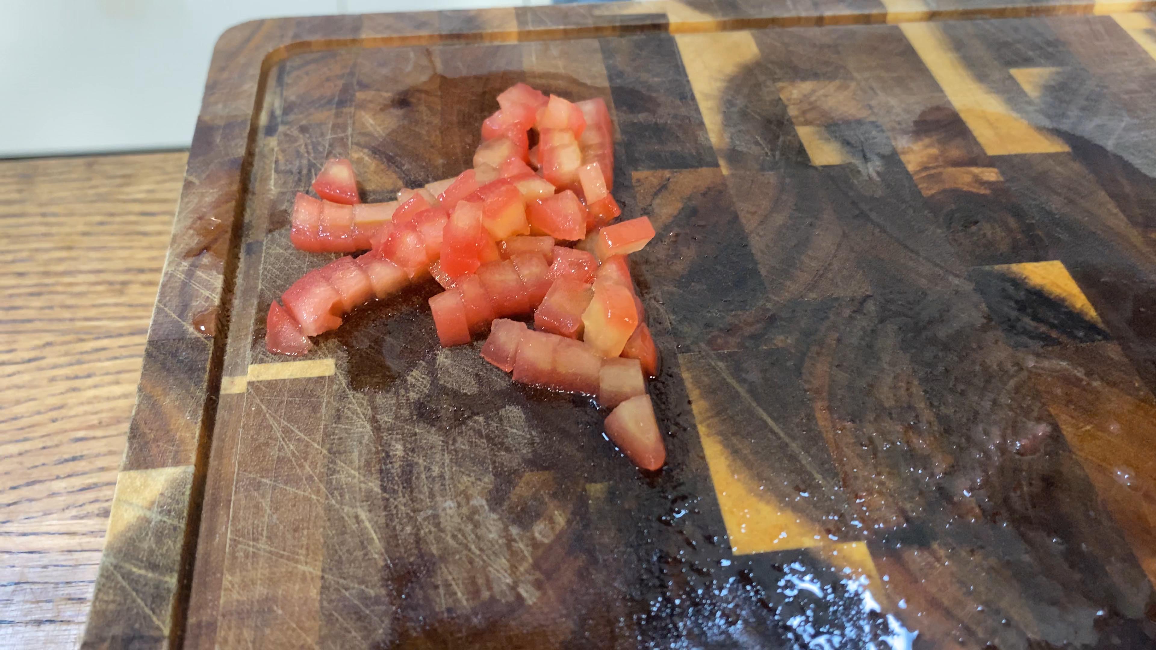 Tomaten ca. 11 Sekunden in kochendem Wasser blanchieren und anschließend im (eis-)kalten Wasserbad abschrecken. Dann die Tomatenschale mit einem kleinen Küchenmesser abziehen.