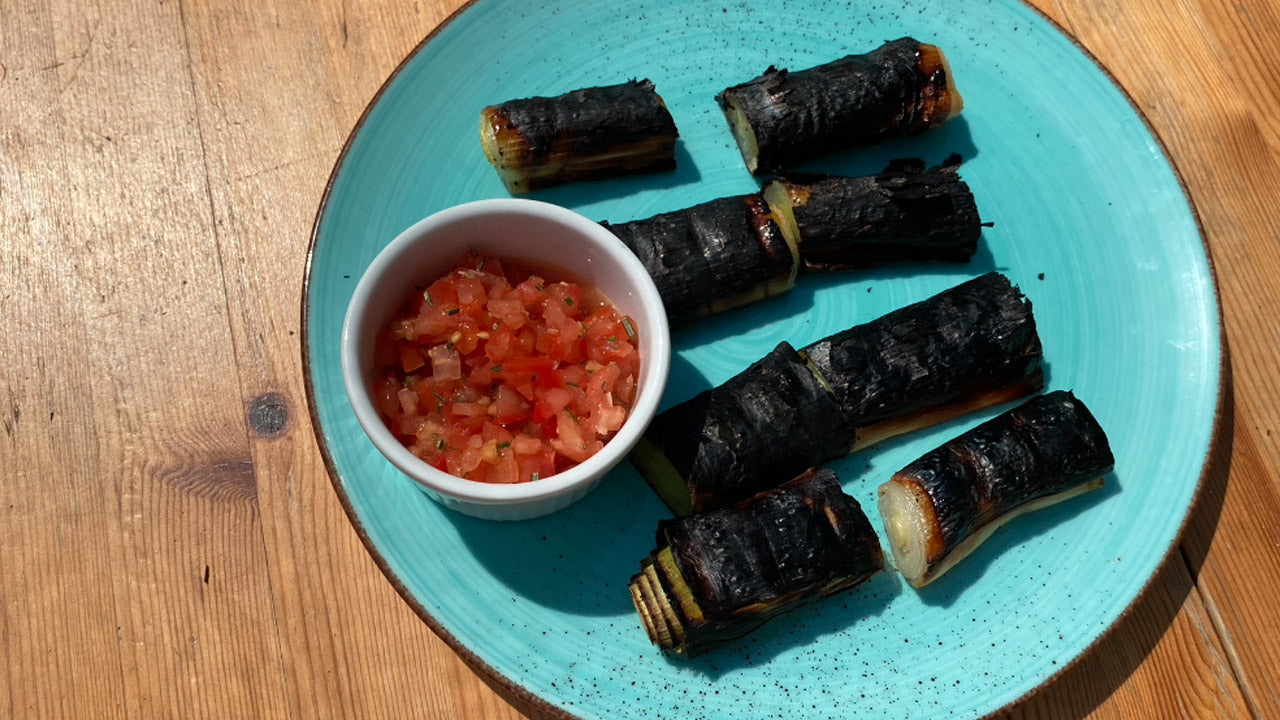 Den schwarz gegrillten Lauch vom Grill nehmen und jeweils dritteln. Lauchteile auf Tellern anrichten und Tomatendip dazureichen -
