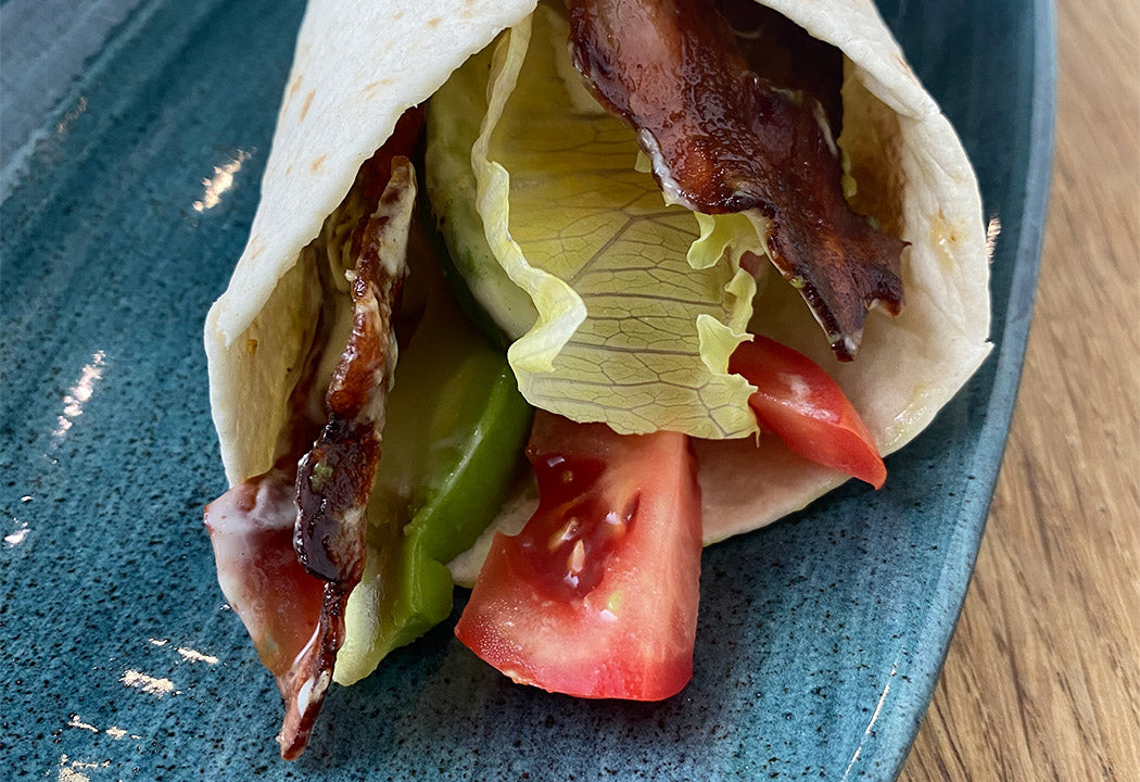 Etwas Mayonnaise darüber träufeln und mit Gewürzsalz und Pfeffermix würzen. Zum Abschluss den Speck, ein Stück Avocado und ein Spiegelei drauflegen und zusammenrollen.