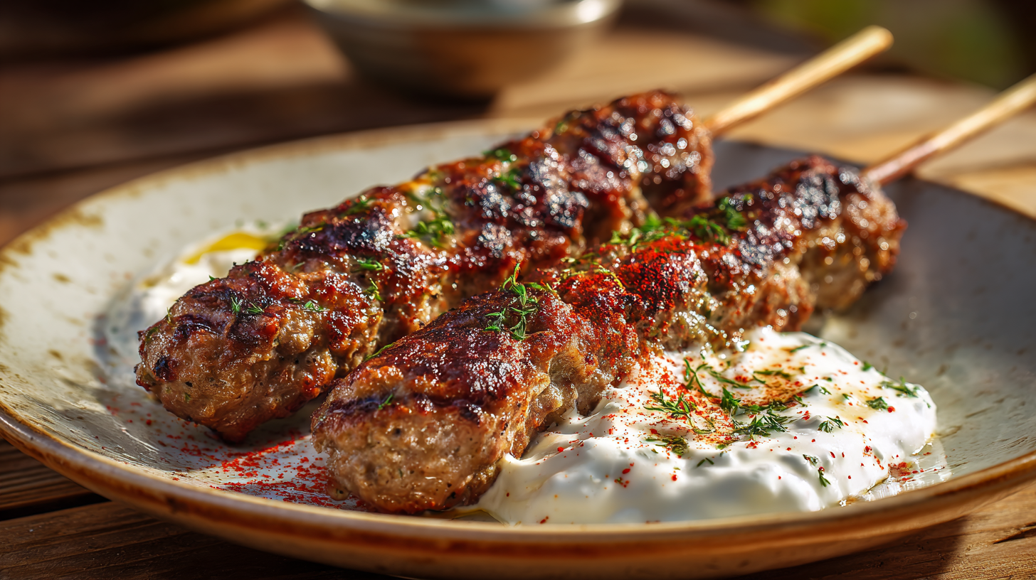 Die Hackfleischmasse in vier gleichgroße Portionen teilen. Anschließend jede Portion jeweils gleichmäßig um zwei Schaschlikspieße formen und gut andrücken. Die Spieße in einer Pfanne mit heißem Bratöl von allen Seiten gar braten. Gegen Ende der Garzeit Butter in die Pfanne geben und die Spieße darin schwenken. Spieße auf Küchenpapier abtropfen lassen. -