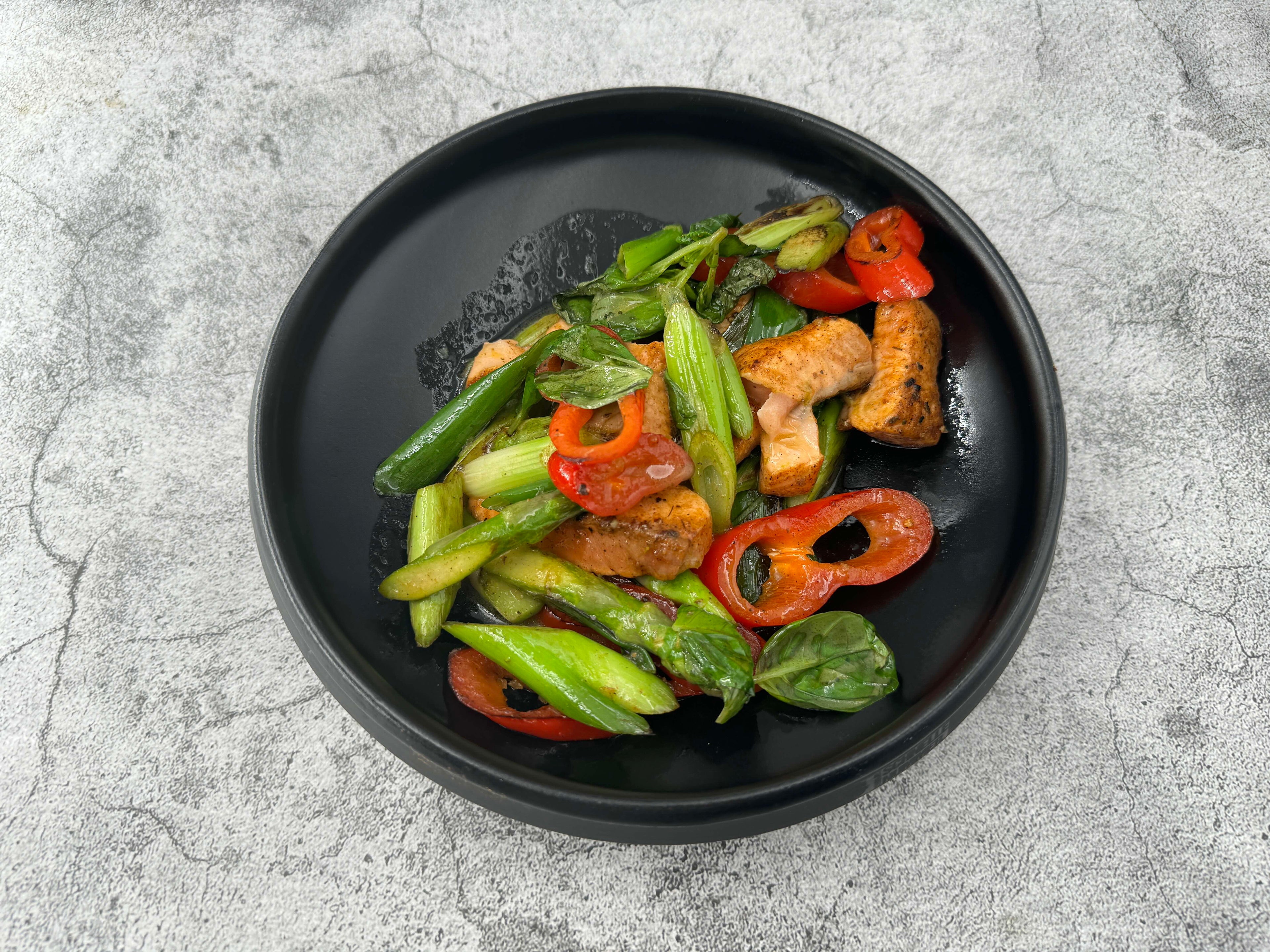 Frühlingszwiebeln putzen und schräg in grobe Stücke schneiden. Spitzpaprika und Spargel waschen und trocknen. Spitzpaprika schräg in dünne Ringe, die holzigen Enden vom Spargel abbrechen und den Spargel schräg in Scheiben schneiden. 1-2 EL Bratöl in der Lachs-Pfanne erhitzen und das Gemüse unter gelegentlichem Schwenken ca. 3-4 Minuten darin anbraten. -