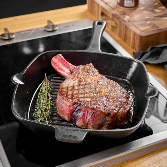 Steakpfanne aus Gusseisen zum Anbraten und Grillen von Fleisch, Fisch und Gemüse