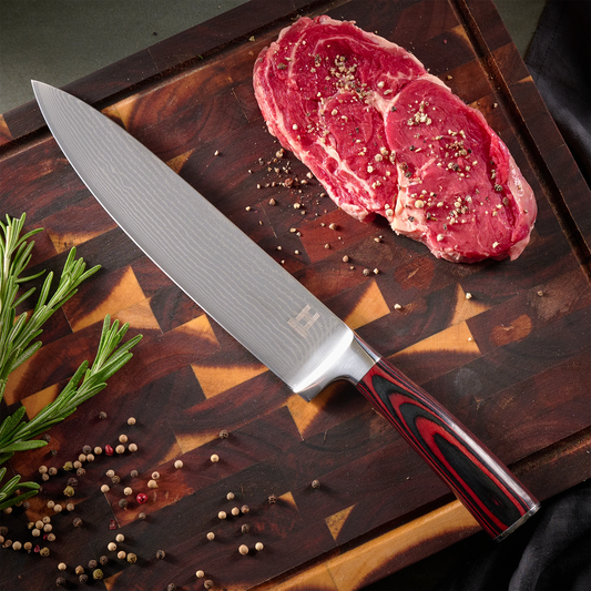 21,3 cm langer und ultrascharfer Klinge aus VG10 Damaststahl mit 67 Lagen und rotem Pakkaholz-Griff