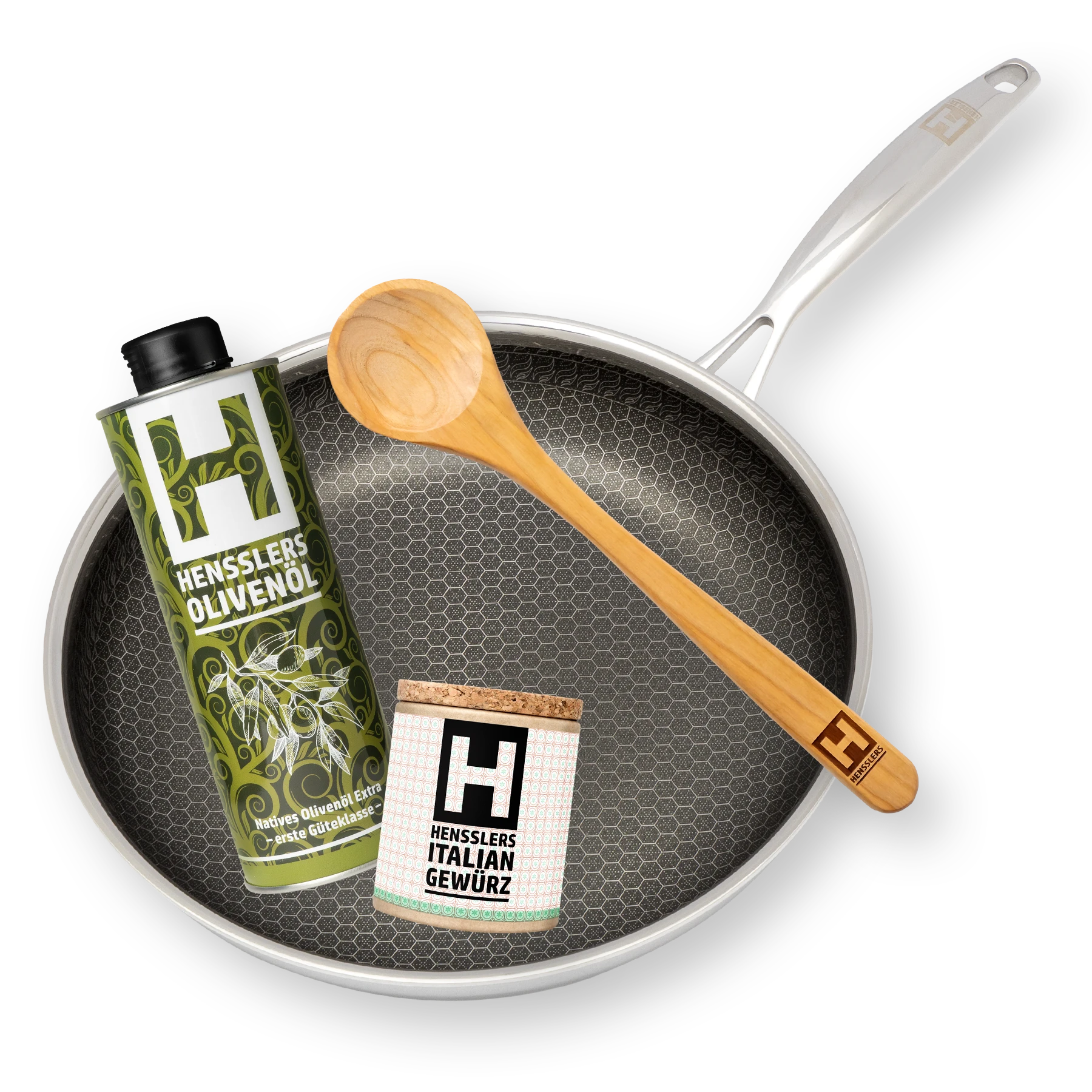 Das HENSSLERS Dinner-for-Two Set ist die ideale Wahl für ein Valentinstags-Dinner zu zweit und vereint vier perfekt aufeinander abgestimmte Küchenbasics: die Pfanne in 28 cm, hochwertiges Olivenöl, das Italian Gewürz und einen massiven Holz-Kochlöffel. Ein Set, das alles mitbringt, was man für gemeinsames Kochen am Valentinstag braucht – reduziert auf das Wesentliche, ohne Kompromisse bei Qualität und Funktion.
